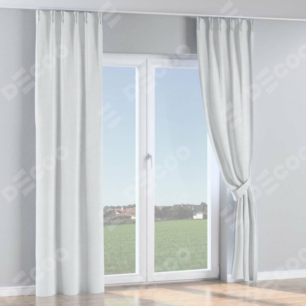 Комплект прямых штор, от производителя «Cortin», пошиты из ткани блэкаут однотонный дымчато-белый, артикул ткани 101. С изнаночной стороны в верхней части штор пристрачивается шторная лента с декоративными складками «Кустик». Для создания элегантных складок прямые шторы шьются по стандарту с коэффициентом 1:2 (на 100 см. ширины проёма 200 см. ширины ткани).