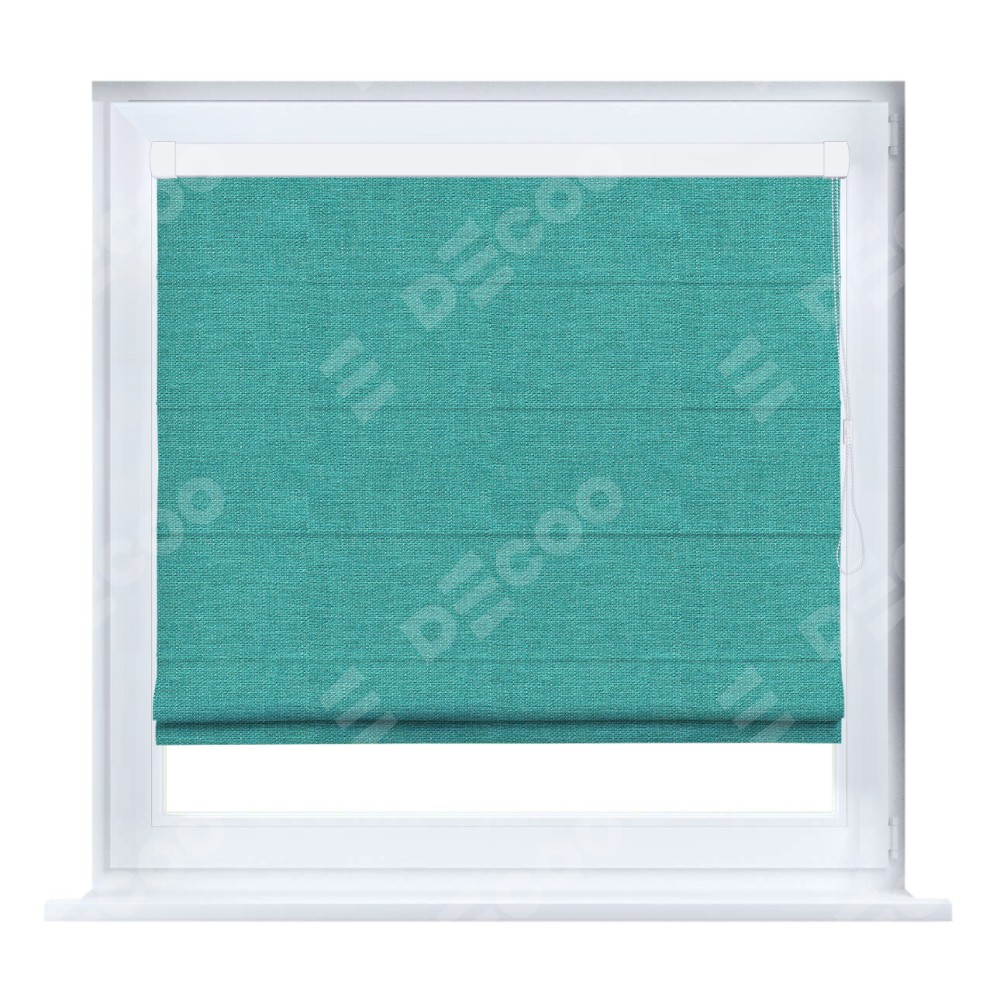 Римская штора кассетного типа, производителя «Cortin», устанавливается только на пластиковые окна и прилегает к стеклопакету, пошита из ткани лён изумрудный, артикул 85908.