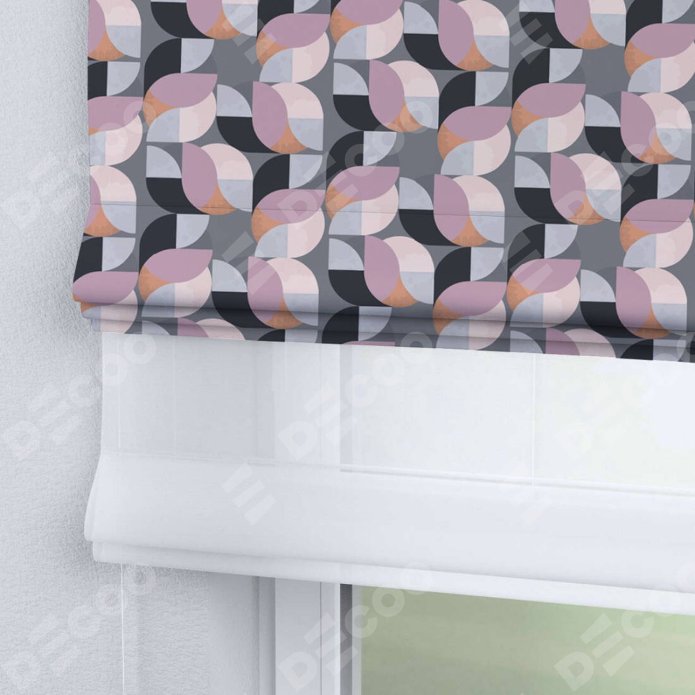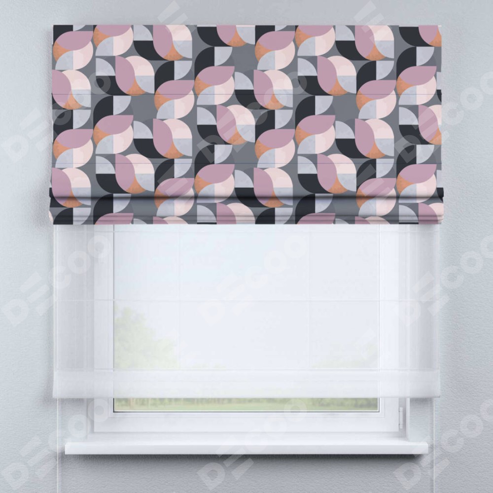 Римская штора день-ночь производителя «Cortin», используется для проёма, пошита из двух полотен, с лицевой блэкаут с нанесением сублимационной печати «Абстрактный узор», вторая ткань тюль (по стандарту комплектуется тюль белого цвета артикул V-01). Имеет универсальный механизм и подходит для монтажа: на потолок, на стену и в нишу.