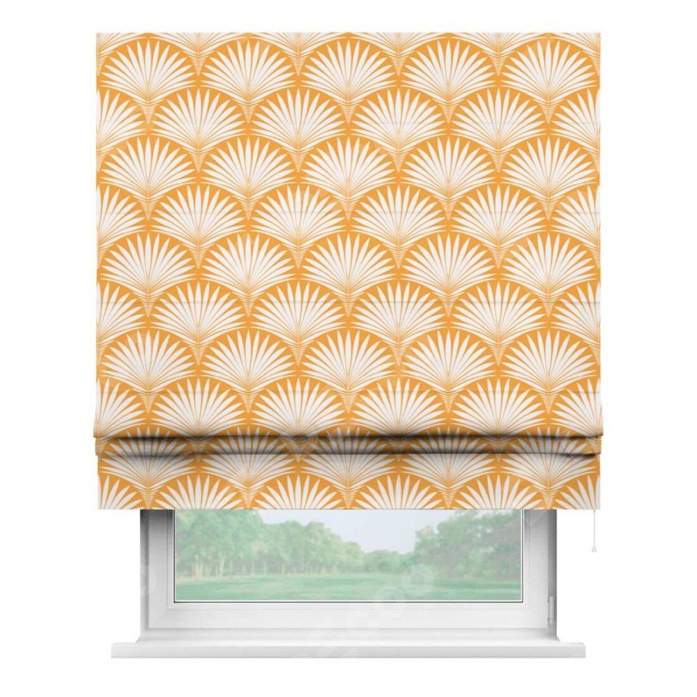 Римская штора производителя «Cortin», используется для проёма, пошита из ткани блэкаут с нанесением сублимационной печати «Арт-деко листья желтый». Имеет универсальный механизм и подходит для монтажа: на потолок, на стену и в нишу.