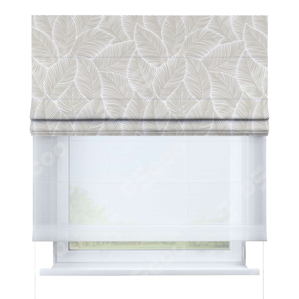 Римская штора день-ночь производителя «Cortin», используется для проёма, пошита из двух полотен, с лицевой блэкаут с нанесением сублимационной печати «Бежевые листья», вторая ткань тюль (по стандарту комплектуется тюль белого цвета артикул V-01). Имеет универсальный механизм и подходит для монтажа: на потолок, на стену и в нишу.