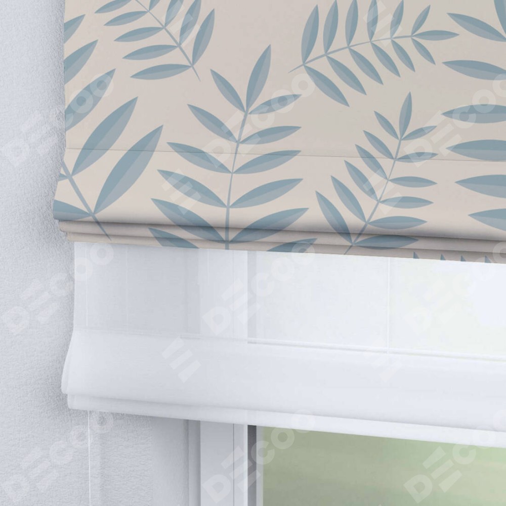 Римская штора день-ночь производителя «Cortin», используется для проёма, пошита из двух полотен, с лицевой блэкаут с нанесением сублимационной печати «Веточка с листочками», вторая ткань тюль (по стандарту комплектуется тюль белого цвета артикул V-01). Имеет универсальный механизм и подходит для монтажа: на потолок, на стену и в нишу.