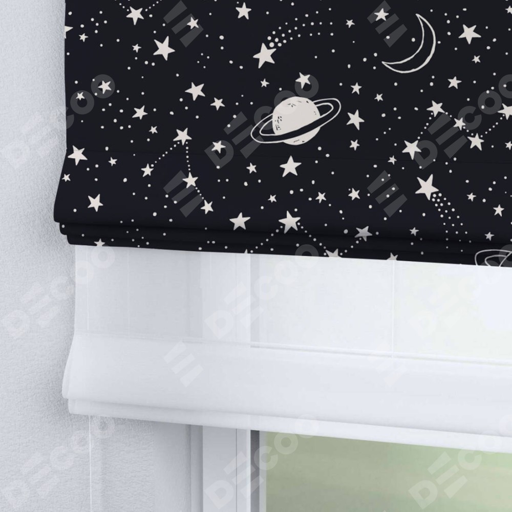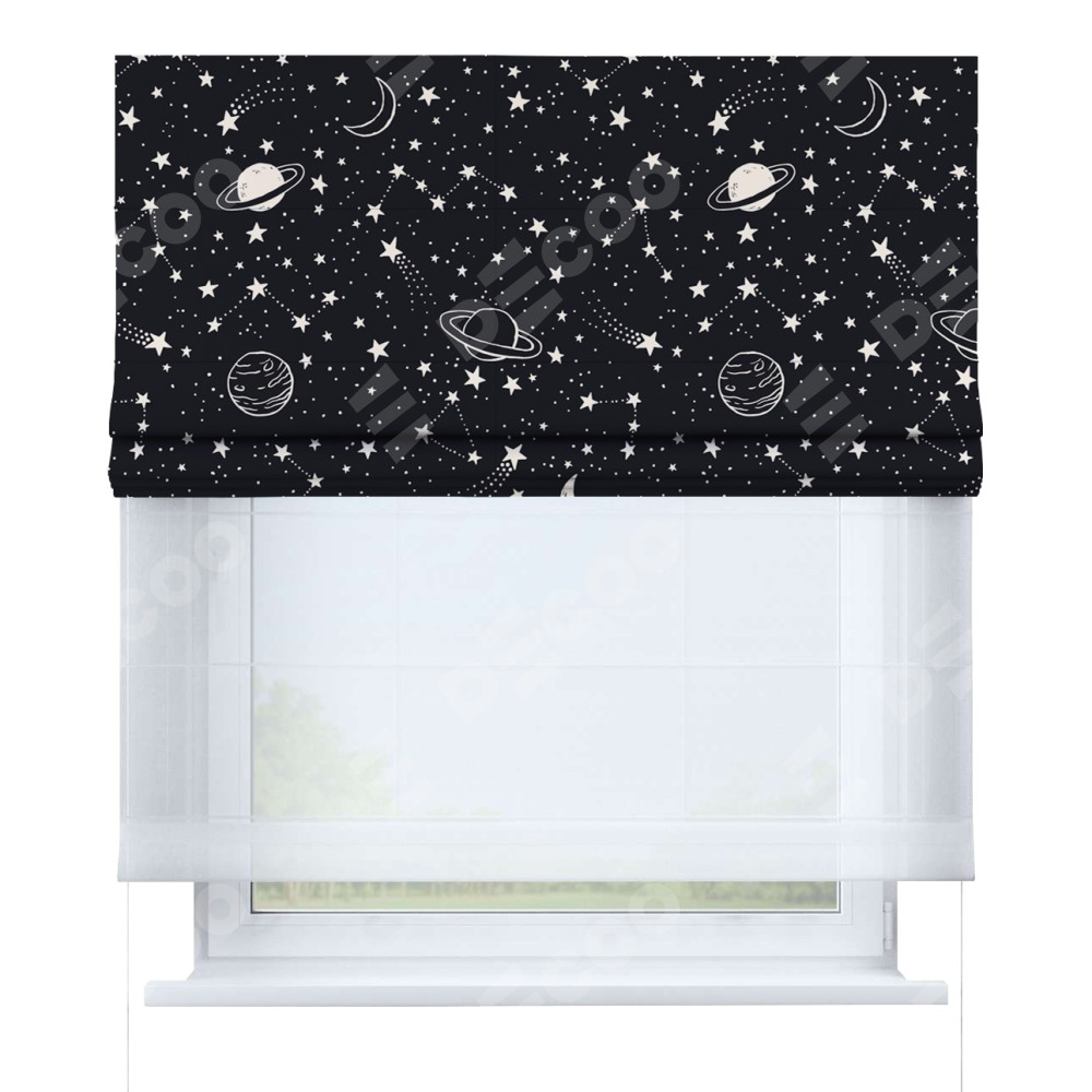 Римская штора день-ночь производителя «Cortin», используется для проёма, пошита из двух полотен, с лицевой блэкаут с нанесением сублимационной печати «Глубокий космос», вторая ткань тюль (по стандарту комплектуется тюль белого цвета артикул V-01). Имеет универсальный механизм и подходит для монтажа: на потолок, на стену и в нишу.