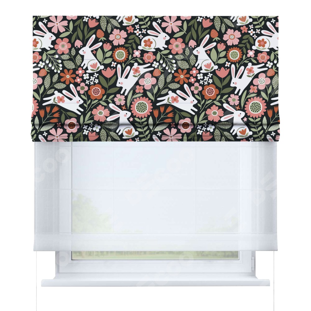 Римская штора день-ночь производителя «Cortin», используется для проёма, пошита из двух полотен, с лицевой блэкаут с нанесением сублимационной печати «Зайчики в цветнике», вторая ткань тюль (по стандарту комплектуется тюль белого цвета артикул V-01). Имеет универсальный механизм и подходит для монтажа: на потолок, на стену и в нишу.