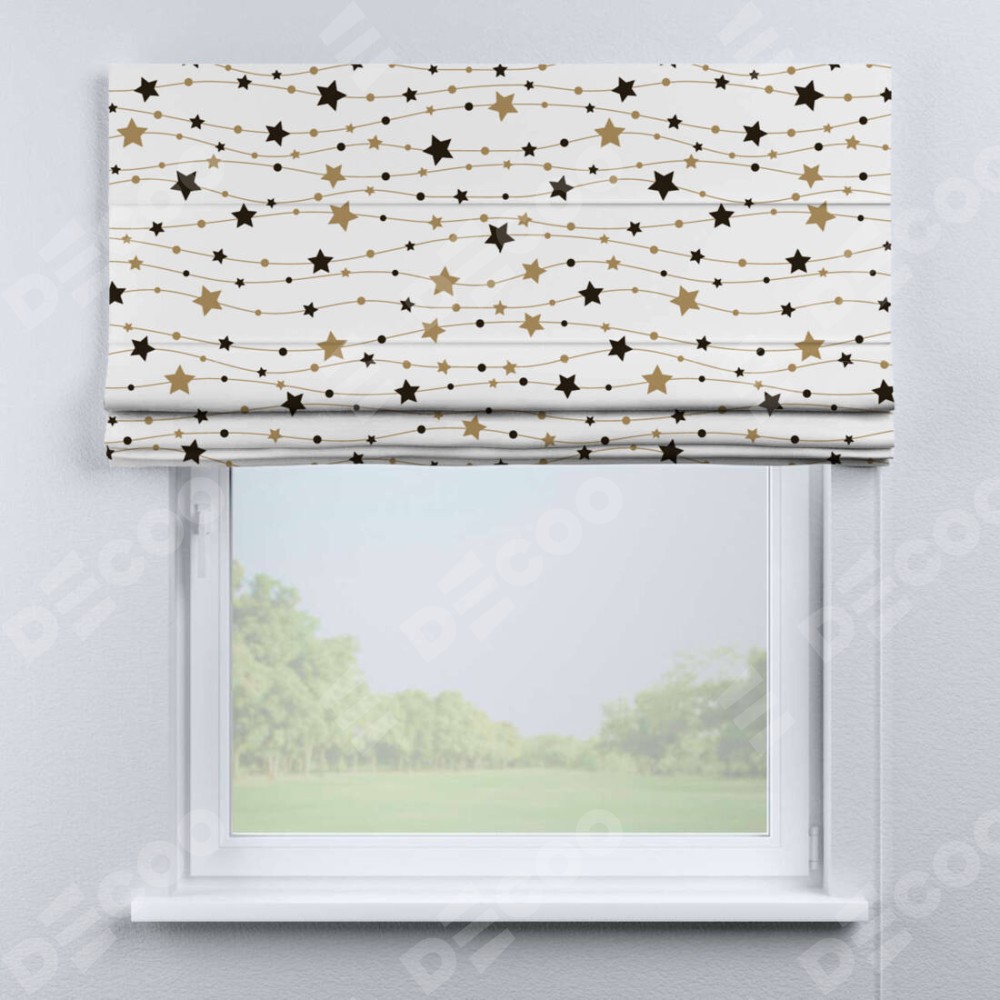 Римская штора производителя «Cortin», используется для проёма, пошита из ткани блэкаут с нанесением сублимационной печати «Звёздная нить». Имеет универсальный механизм и подходит для монтажа: на потолок, на стену и в нишу.