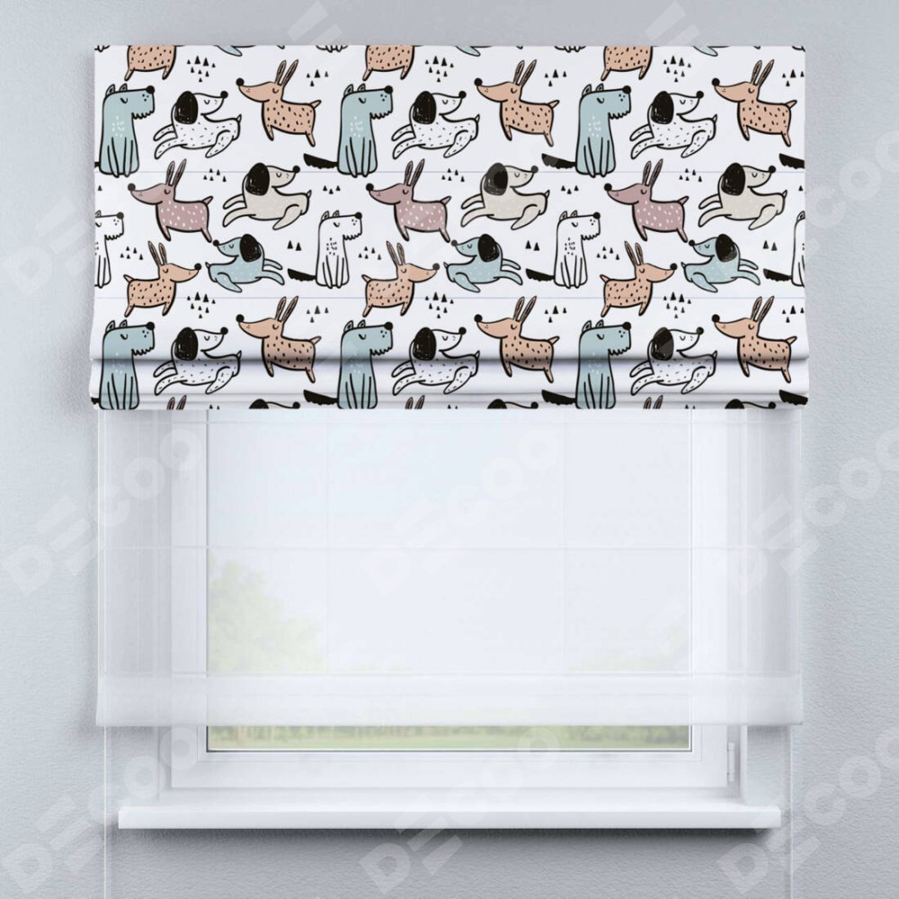 Римская штора день-ночь производителя «Cortin», используется для проёма, пошита из двух полотен, с лицевой блэкаут с нанесением сублимационной печати «Очаровательные щеночки», вторая ткань тюль (по стандарту комплектуется тюль белого цвета артикул V-01). Имеет универсальный механизм и подходит для монтажа: на потолок, на стену и в нишу.