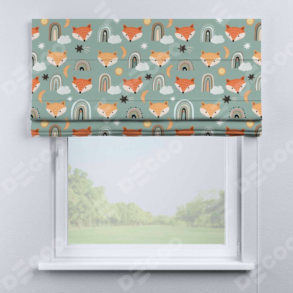 Римская штора производителя «Cortin», используется для проёма, пошита из ткани блэкаут с нанесением сублимационной печати «Озорные лисички». Имеет универсальный механизм и подходит для монтажа: на потолок, на стену и в нишу.