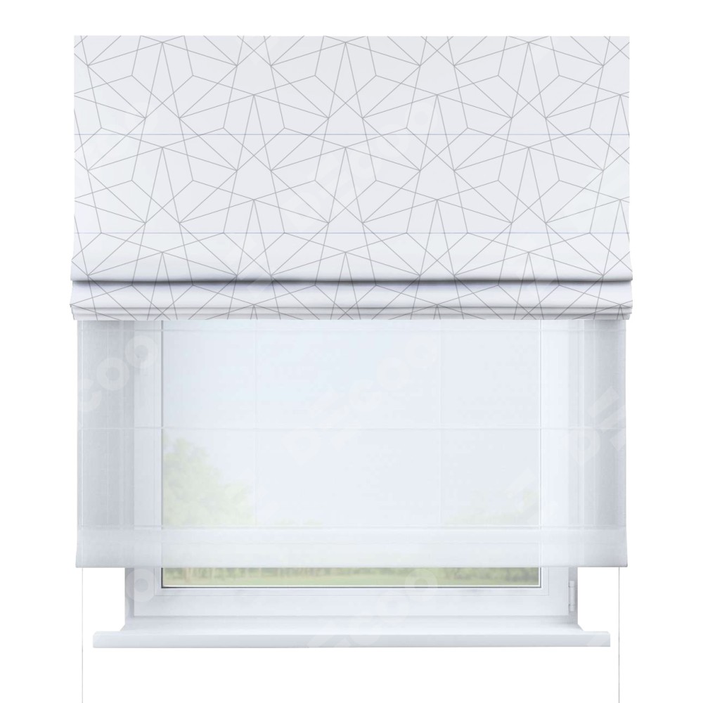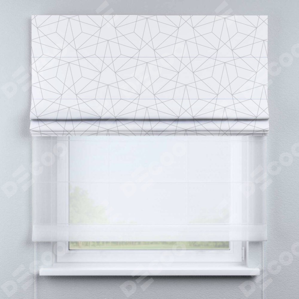 Римская штора день-ночь производителя «Cortin», используется для проёма, пошита из двух полотен, с лицевой блэкаут с нанесением сублимационной печати «Простая геометрия», вторая ткань тюль (по стандарту комплектуется тюль белого цвета артикул V-01). Имеет универсальный механизм и подходит для монтажа: на потолок, на стену и в нишу.