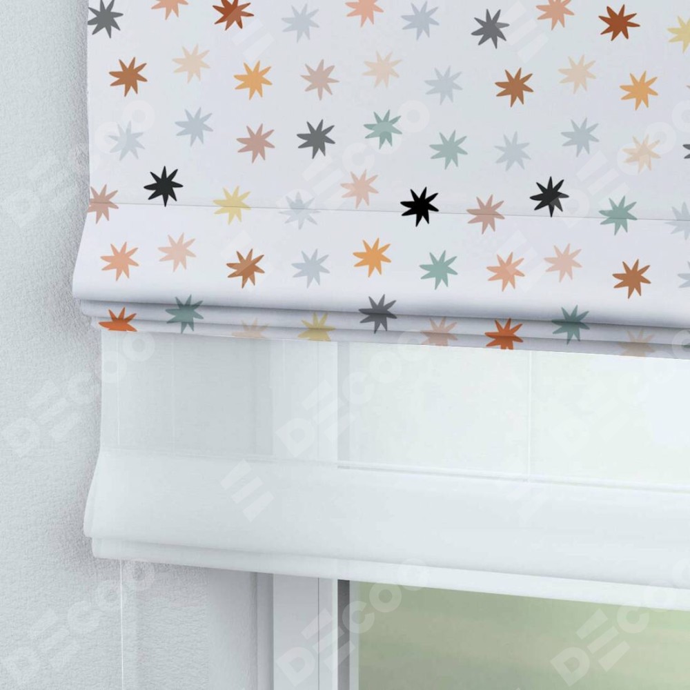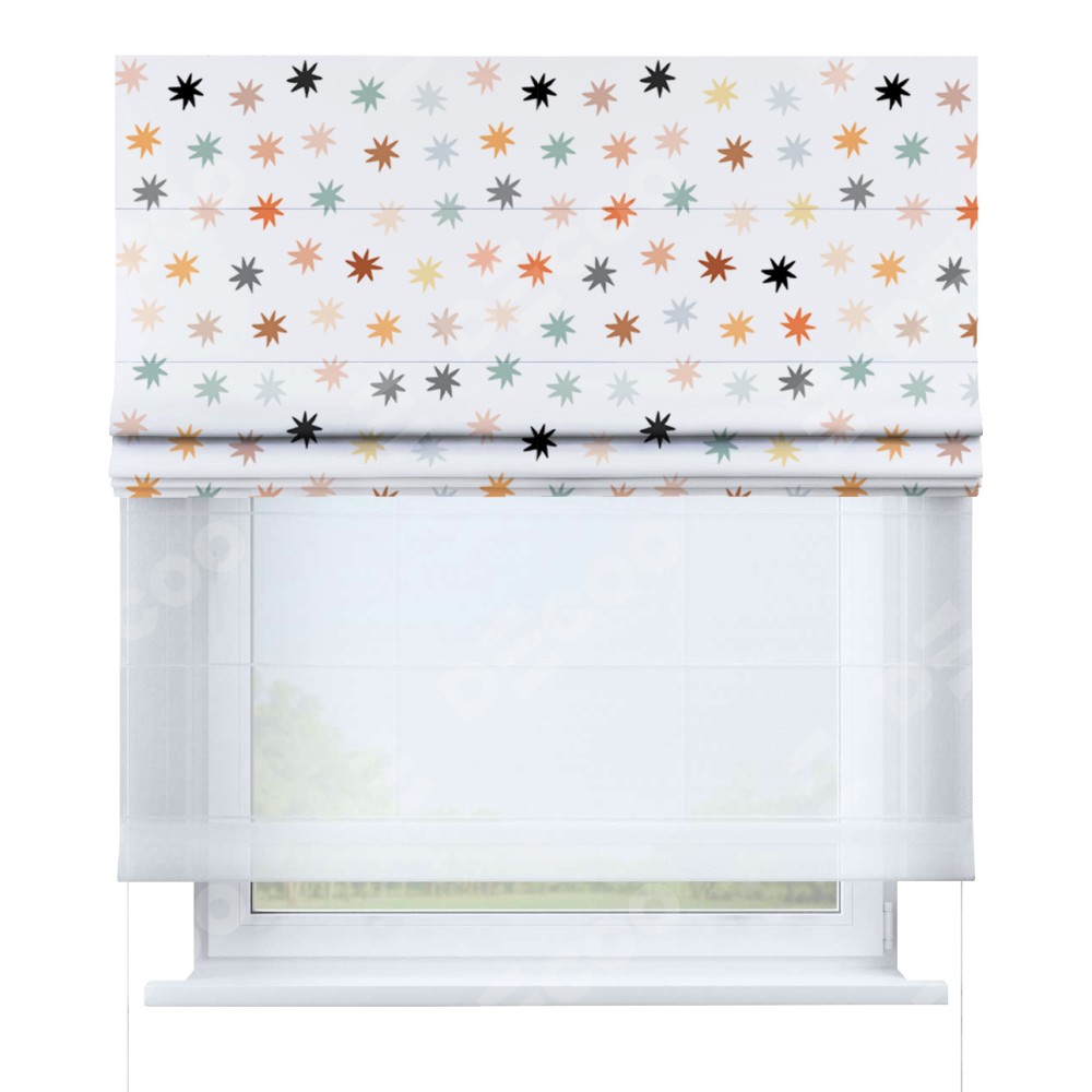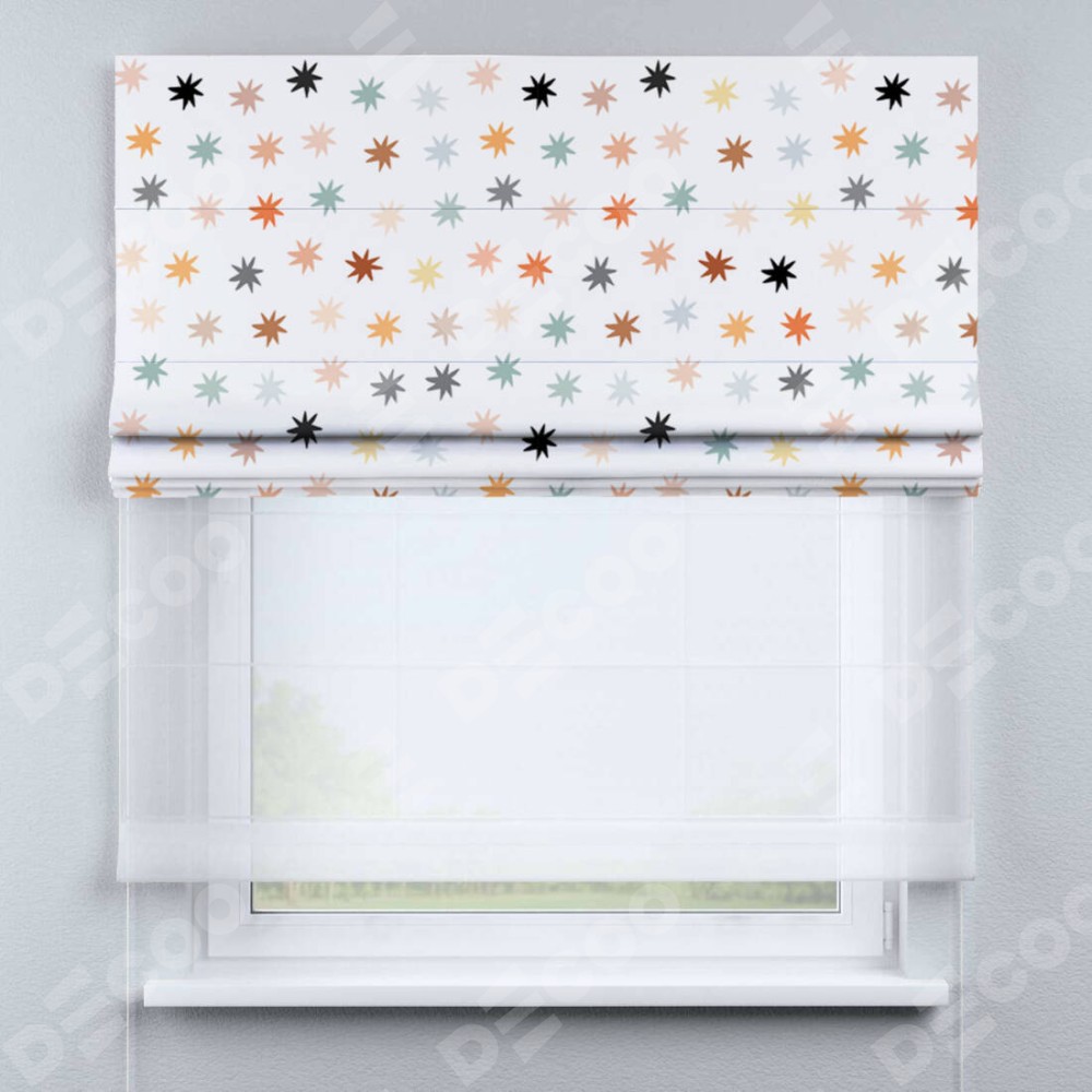 Римская штора день-ночь производителя «Cortin», используется для проёма, пошита из двух полотен, с лицевой блэкаут с нанесением сублимационной печати «Разноцветные звёзды», вторая ткань тюль (по стандарту комплектуется тюль белого цвета артикул V-01). Имеет универсальный механизм и подходит для монтажа: на потолок, на стену и в нишу.