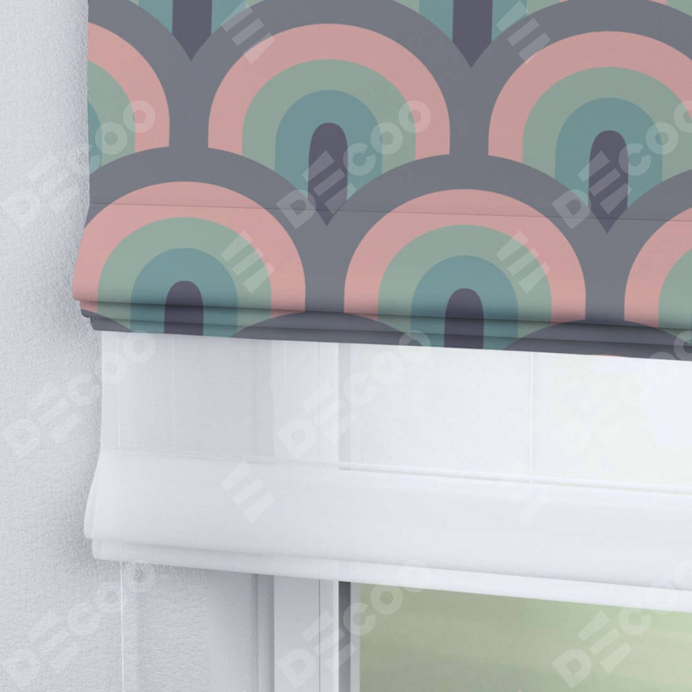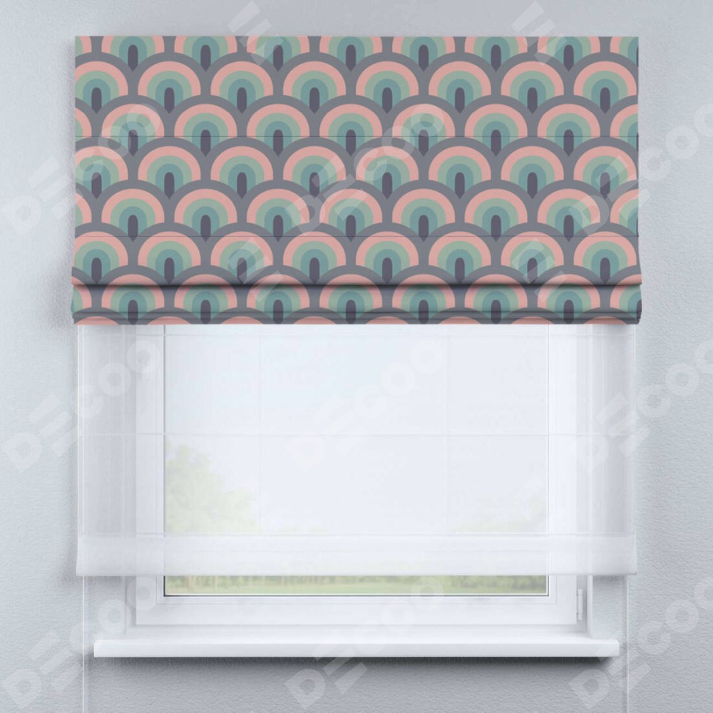 Римская штора день-ночь производителя «Cortin», используется для проёма, пошита из двух полотен, с лицевой блэкаут с нанесением сублимационной печати «Ретро орнамент», вторая ткань тюль (по стандарту комплектуется тюль белого цвета артикул V-01). Имеет универсальный механизм и подходит для монтажа: на потолок, на стену и в нишу.