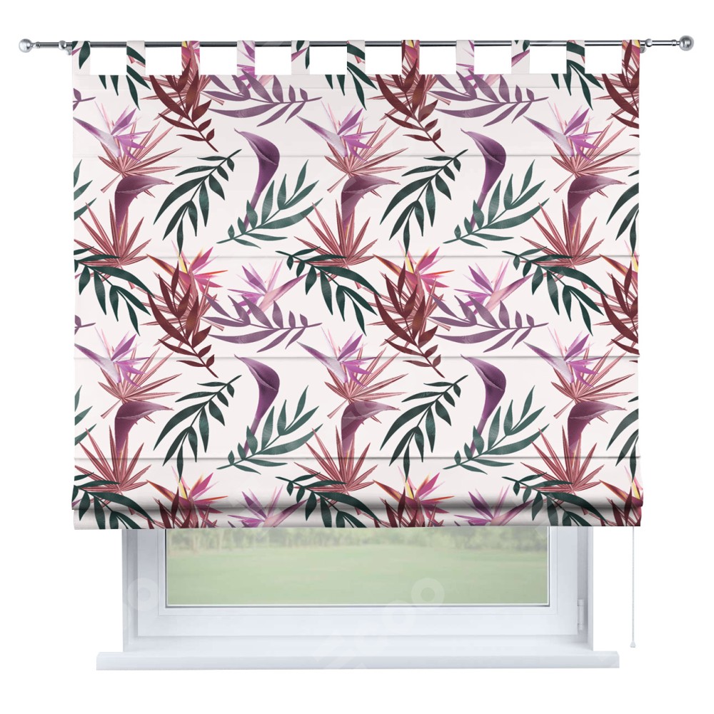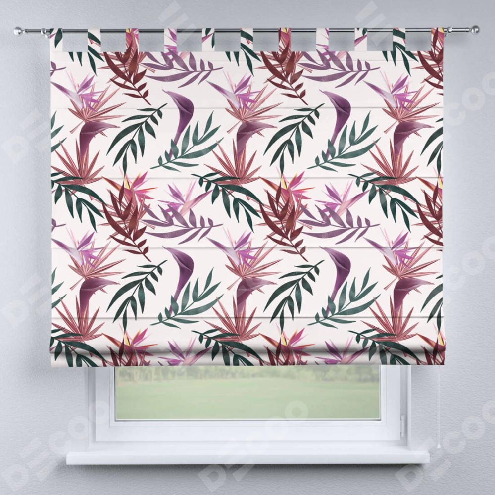 Римская штора производителя «Cortin», используется для проёма, пошита из ткани блэкаут с нанесением сублимационной печати «Тропические побеги». Данная модель пошита на петлях, комплектуется на выбор круглым карнизом и подходит для монтажа на стену. Римская штора на петлях имеет простую систему регулировки высоты, отличительным преимуществом данной модели является простой способ монтажа. Достаточно повесить ее на трубу и штора готова!