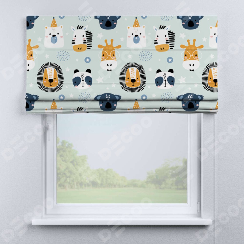 Римская штора производителя «Cortin», используется для проёма, пошита из ткани блэкаут с нанесением сублимационной печати «Чудесный зоопарк». Имеет универсальный механизм и подходит для монтажа: на потолок, на стену и в нишу.