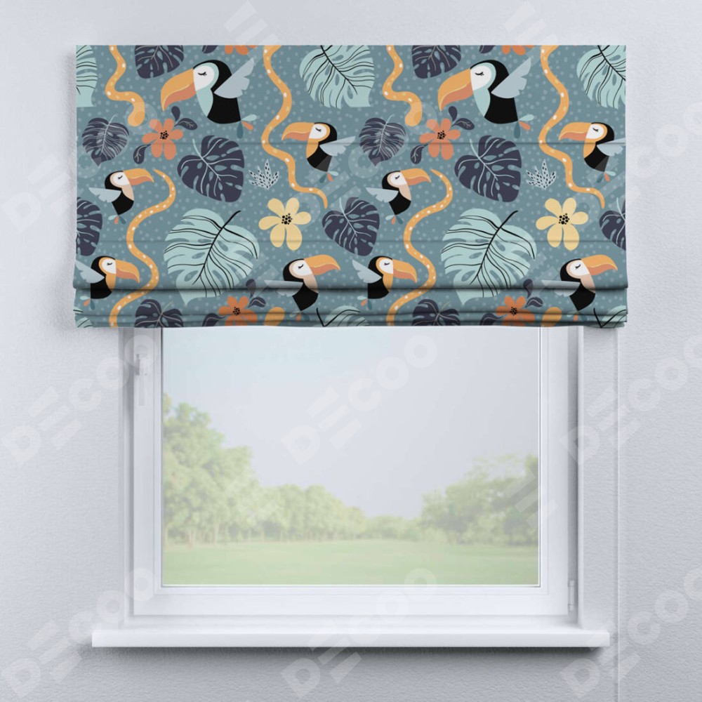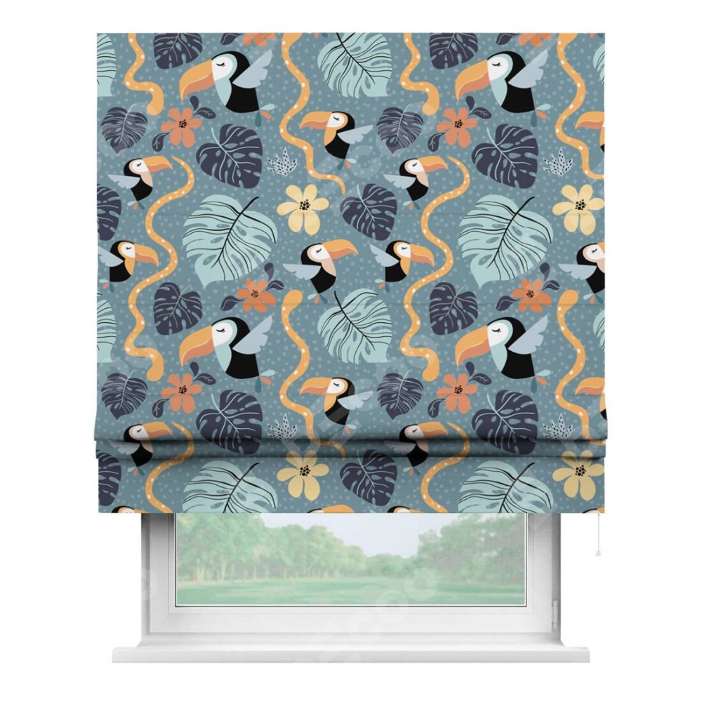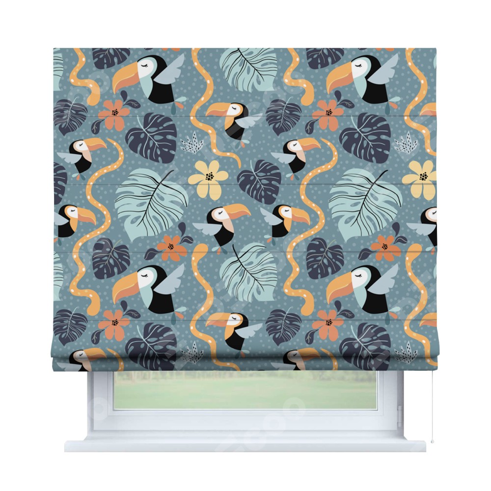 Римская штора производителя «Cortin», используется для проёма, пошита из ткани блэкаут с нанесением сублимационной печати «Экзотические птицы». Имеет универсальный механизм и подходит для монтажа: на потолок, на стену и в нишу.