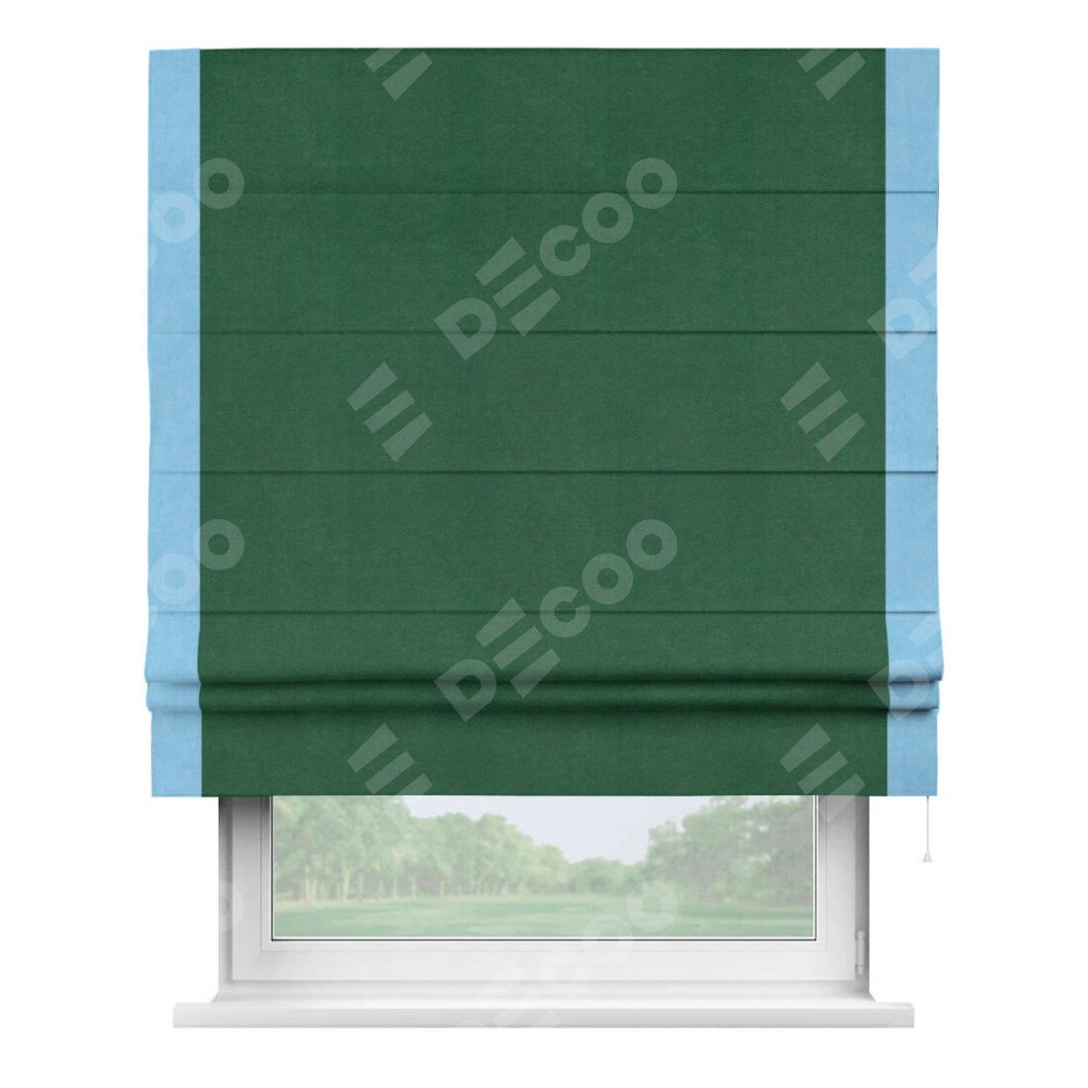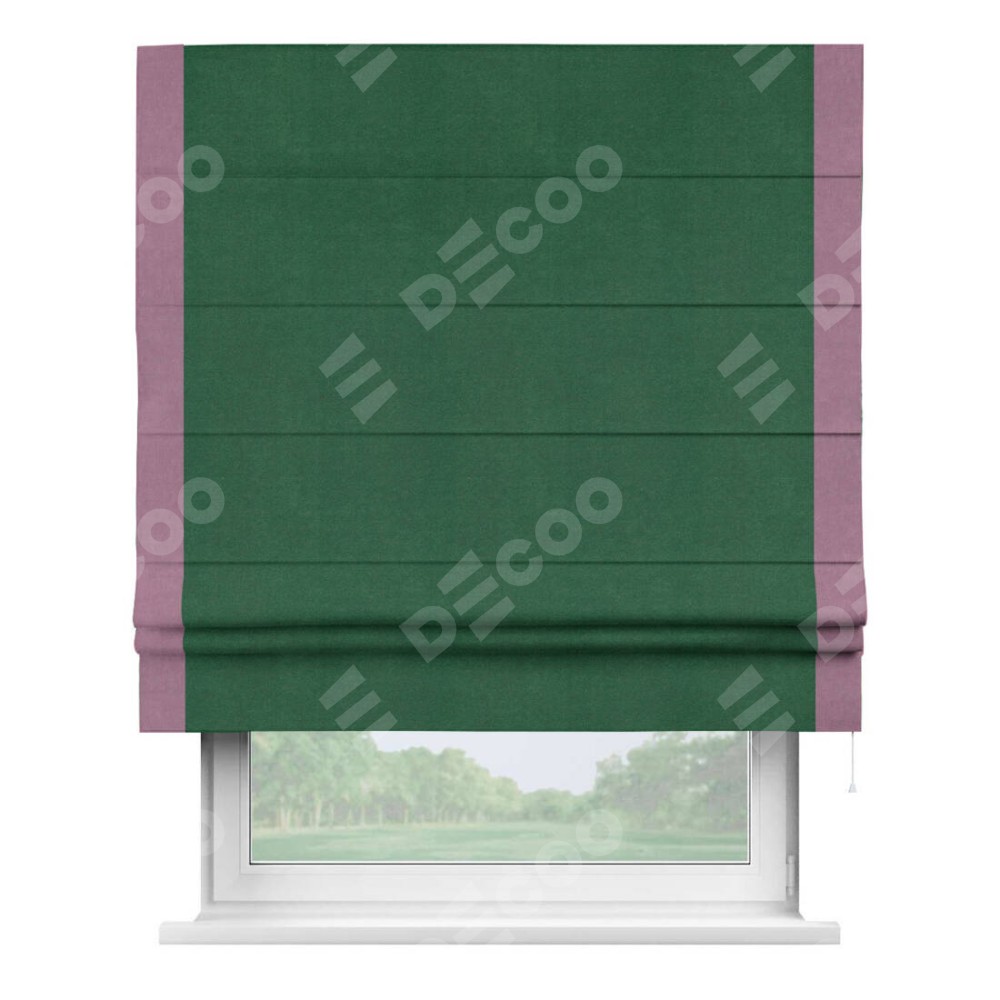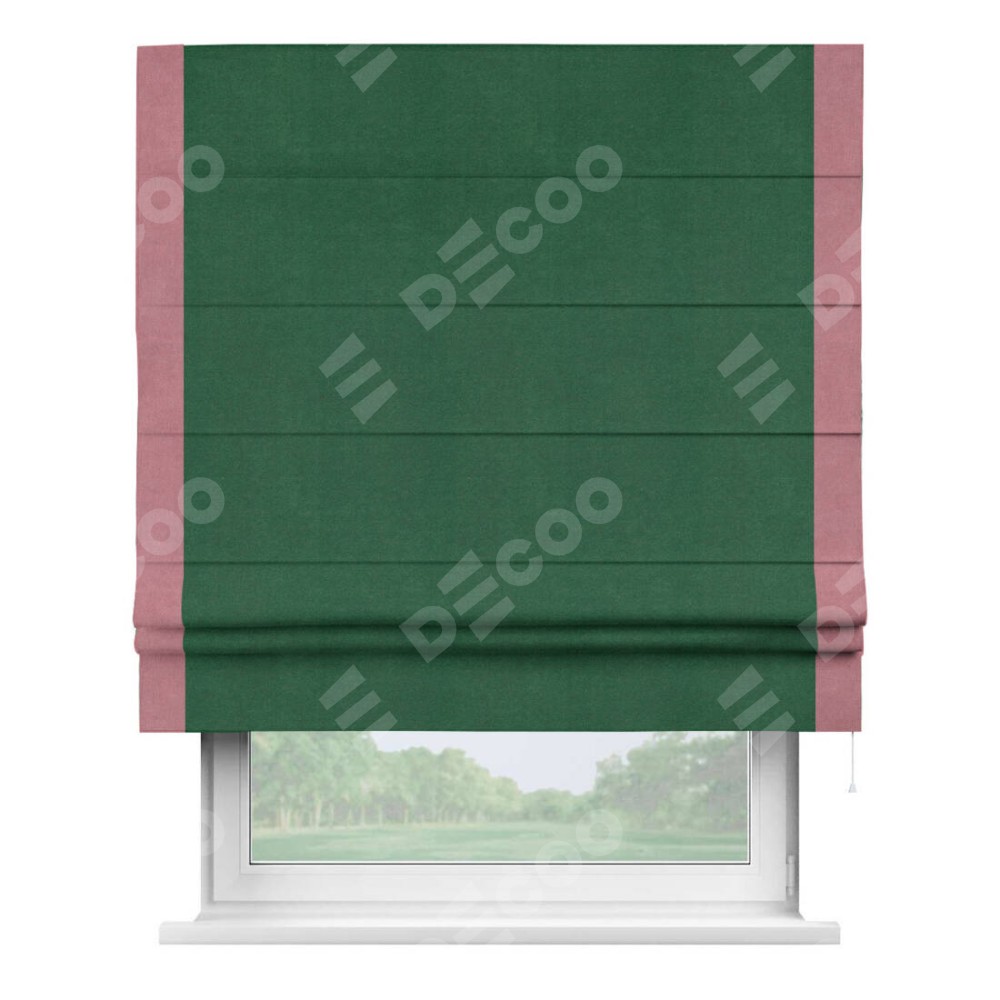 Римская штора производителя «Cortin», используется для проёма, пошита из ткани вельвет зеленый, артикул ткани 85546. Отделка шторы кантом «Стрим Дуо», ткань для канта используется из вельвета разной расцветки на выбор. Имеет универсальный механизм и подходит для монтажа: на потолок, на стену и в нишу.