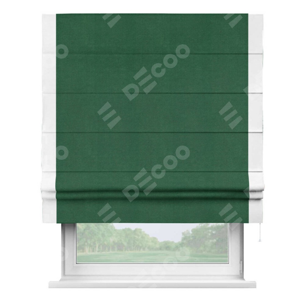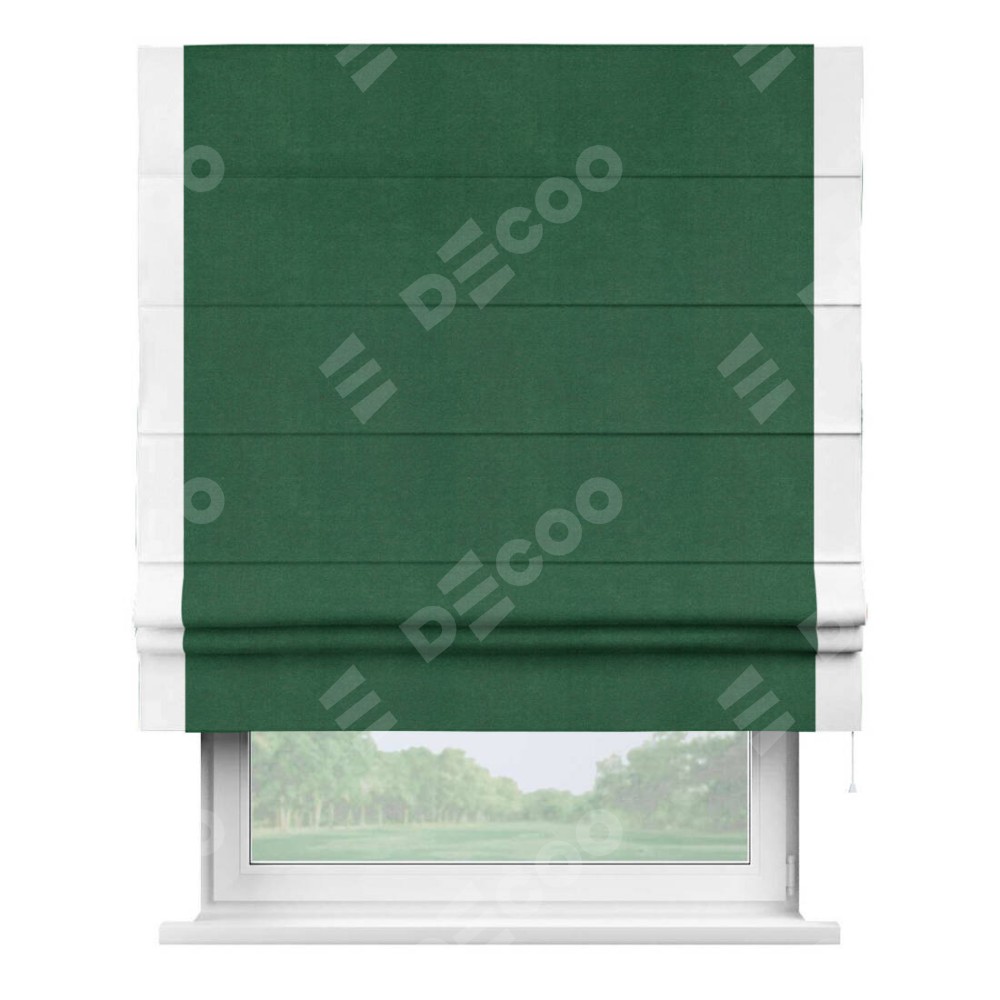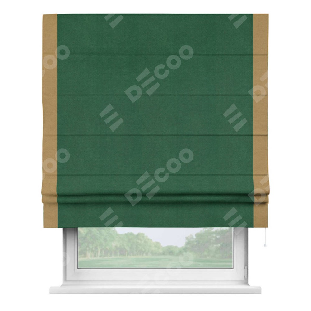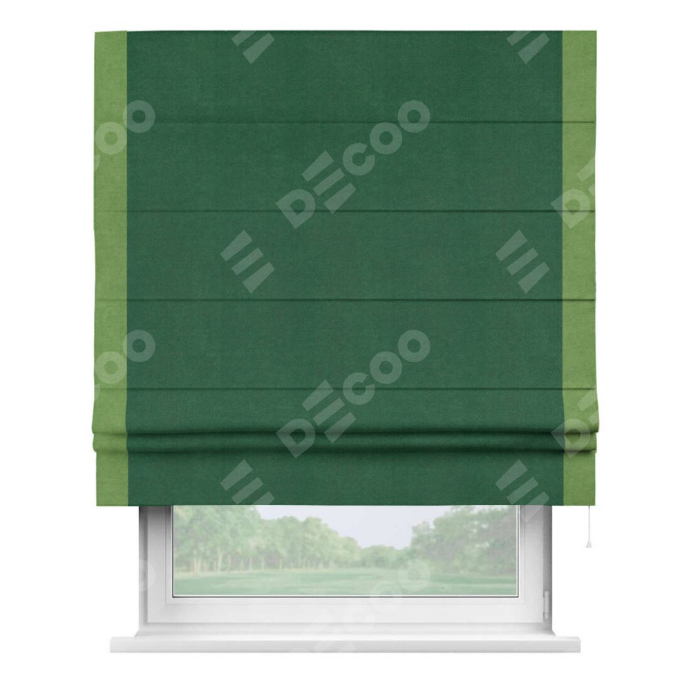Римская штора производителя «Cortin», используется для проёма, пошита из ткани вельвет зеленый, артикул ткани 85546. Отделка шторы кантом «Стрим Дуо», ткань для канта используется из вельвета разной расцветки на выбор. Имеет универсальный механизм и подходит для монтажа: на потолок, на стену и в нишу.