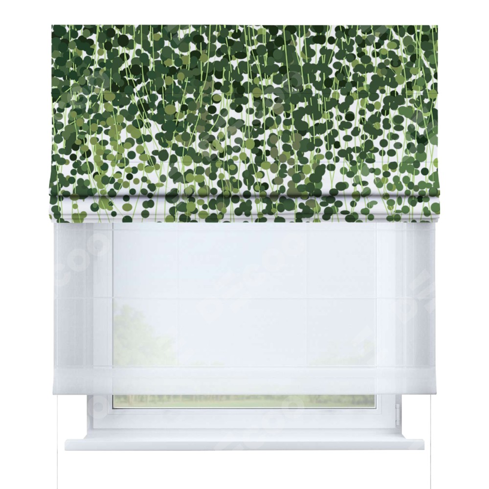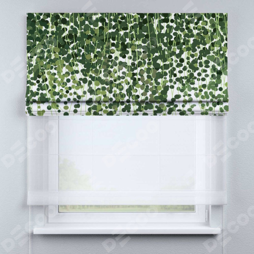 Римская штора день-ночь производителя «Cortin», используется для проёма, пошита из двух полотен, с лицевой блэкаут с нанесением сублимационной печати «Зелёный занавес», вторая ткань тюль (по стандарту комплектуется тюль белого цвета артикул V-01). Имеет универсальный механизм и подходит для монтажа: на потолок, на стену и в нишу.