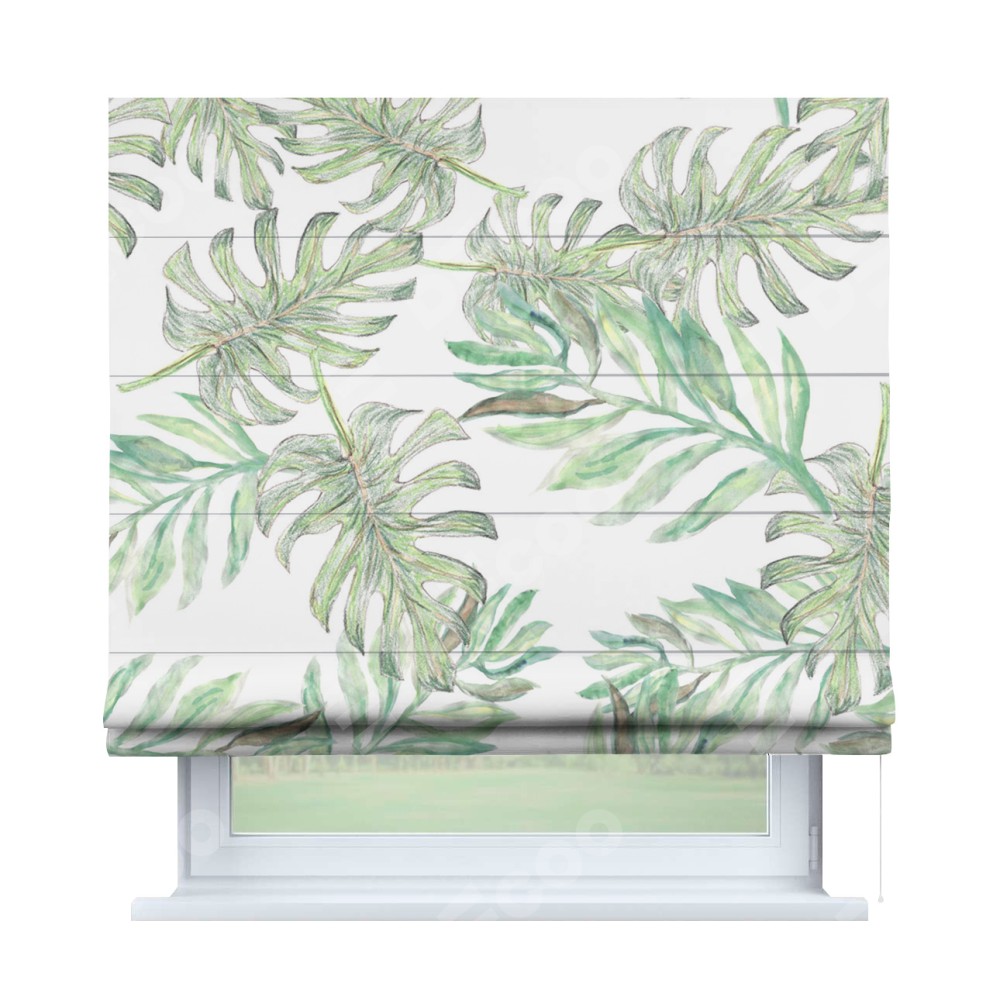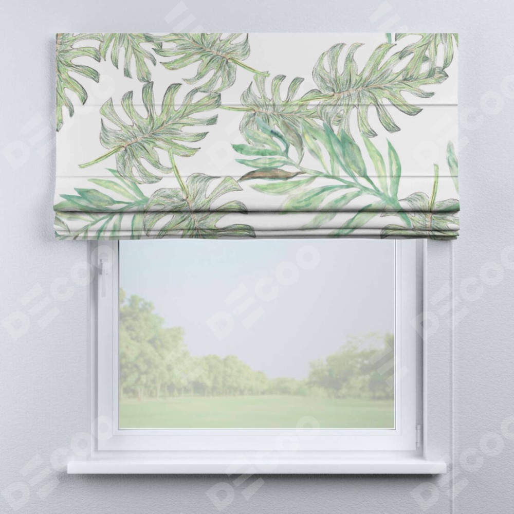 Римская штора производителя «Cortin», используется для проёма, пошита из ткани блэкаут с нанесением сублимационной печати «Листья монстеры». Имеет универсальный механизм и подходит для монтажа: на потолок, на стену и в нишу.