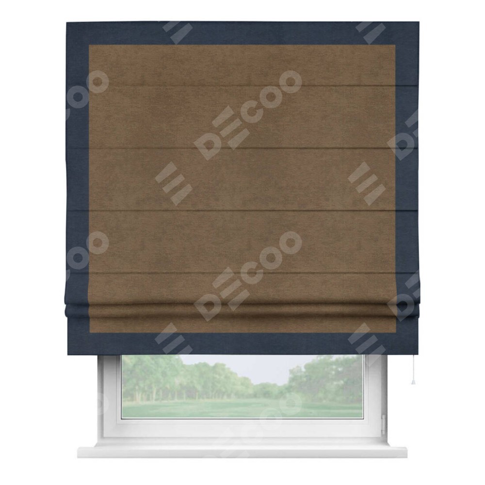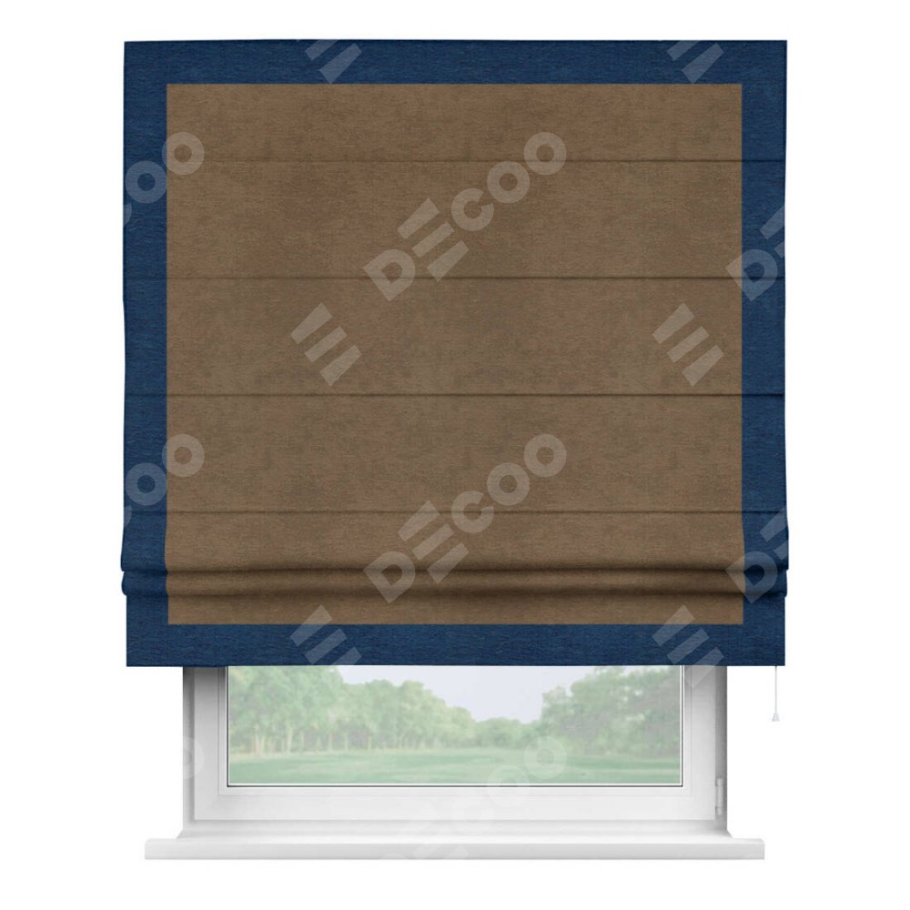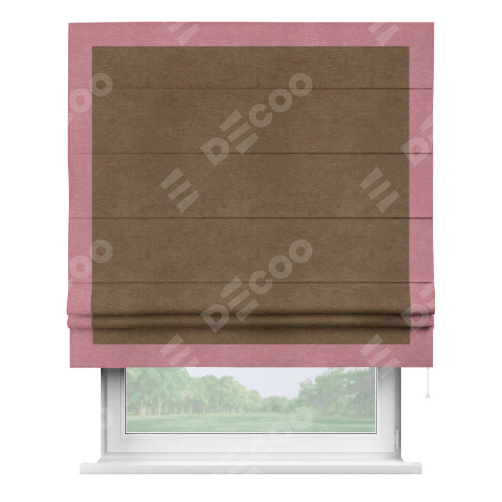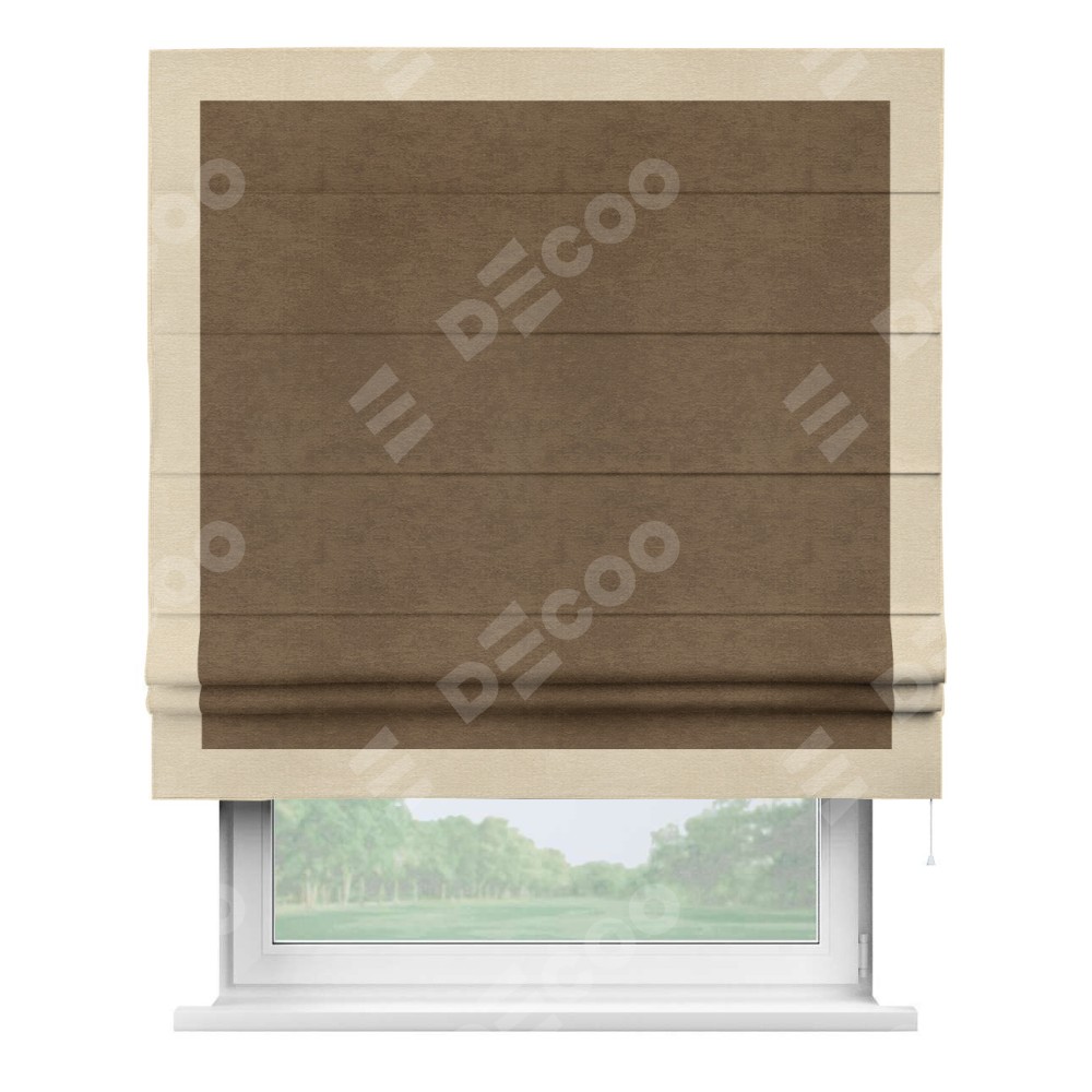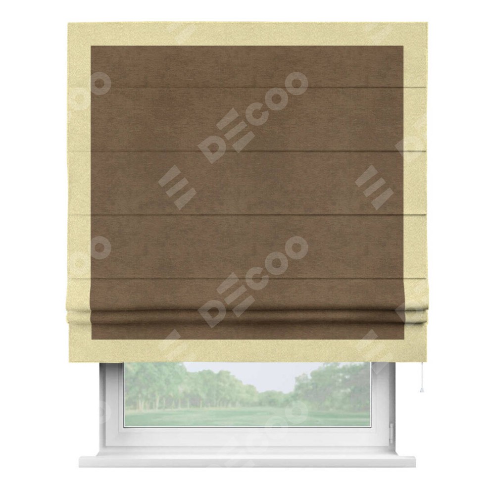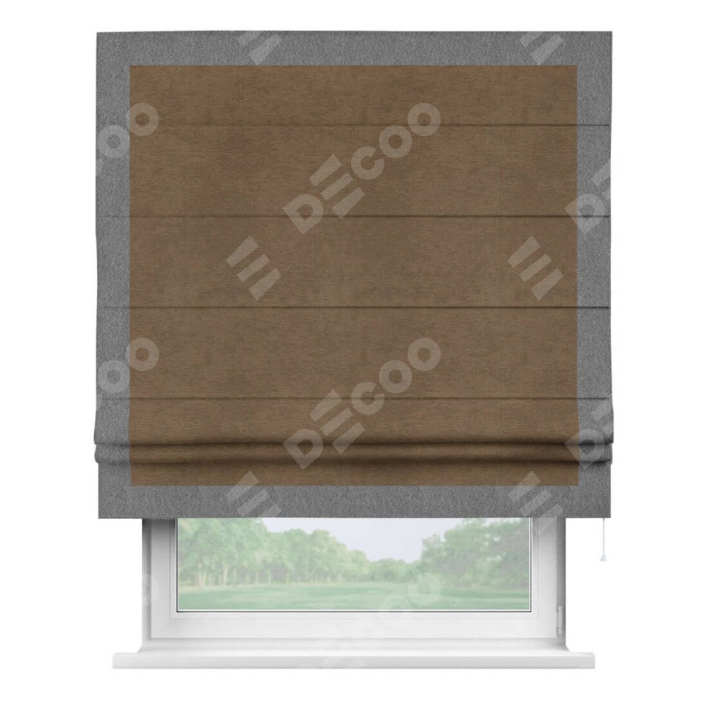 Римская штора производителя «Cortin», используется для проёма, пошита из ткани софт однотонный бронзовый, артикул 33099. Отделка шторы кантом «Чесс», ткань для канта используется из софта разной расцветки на выбор. Имеет универсальный механизм и подходит для монтажа: на потолок, на стену и в нишу.