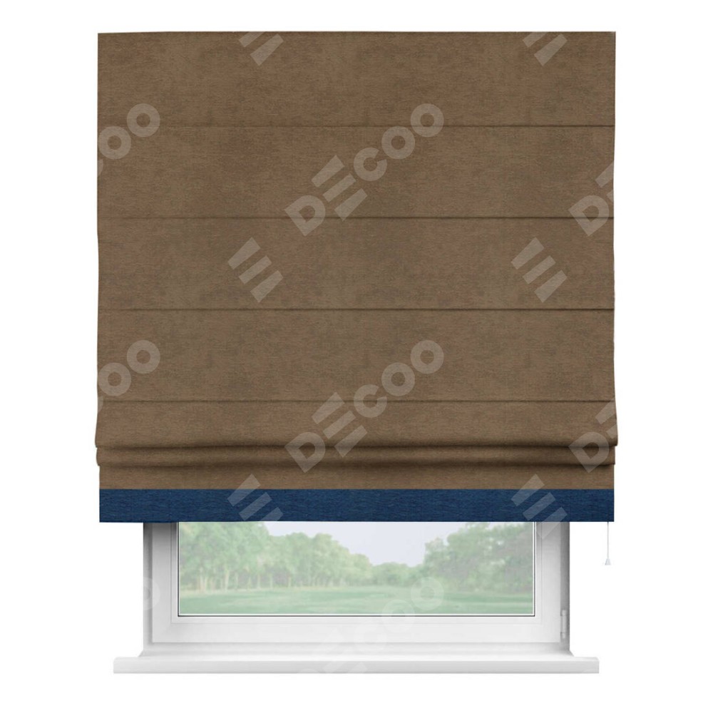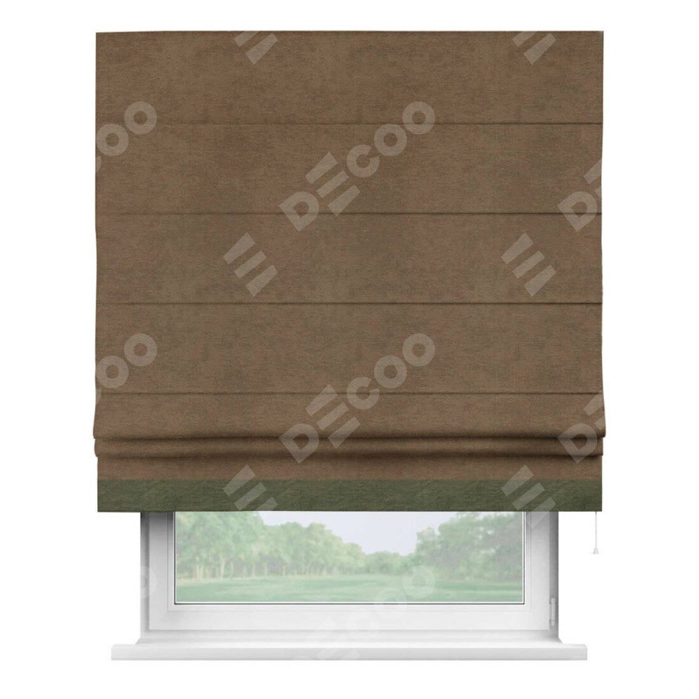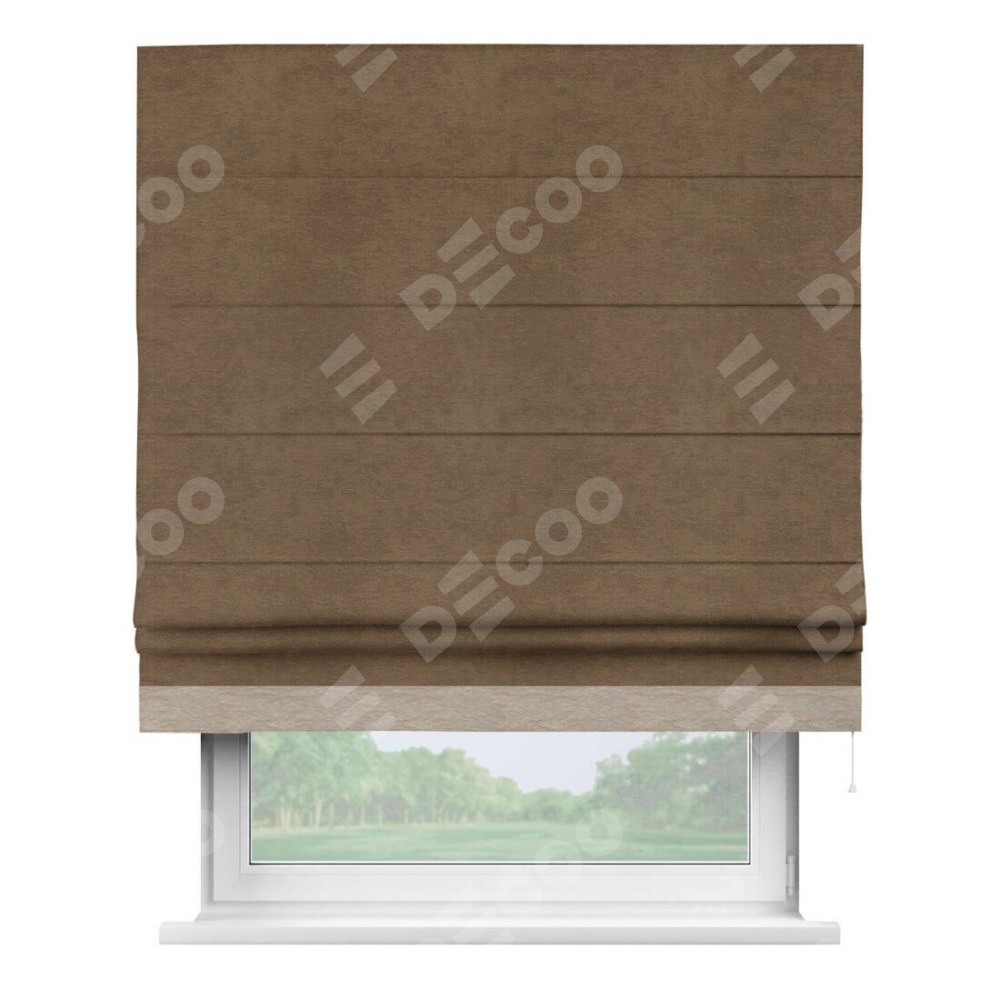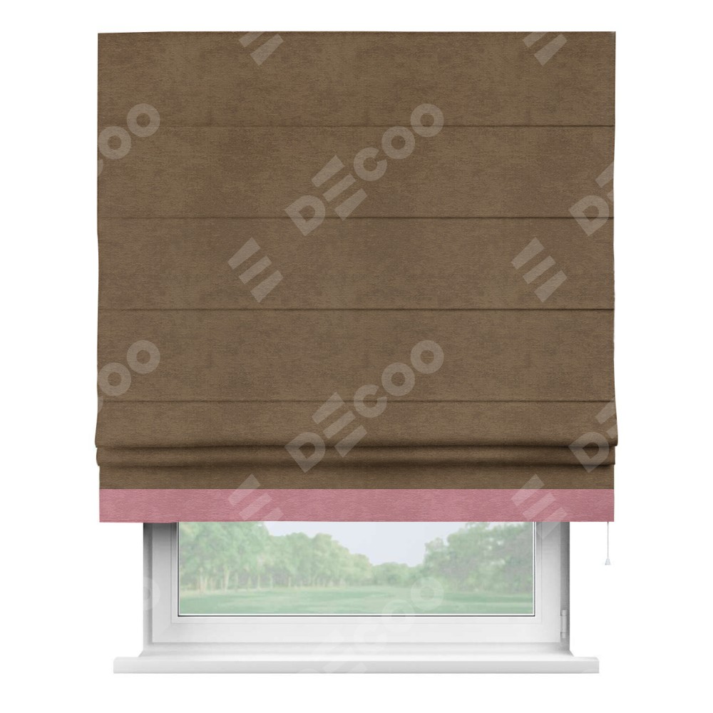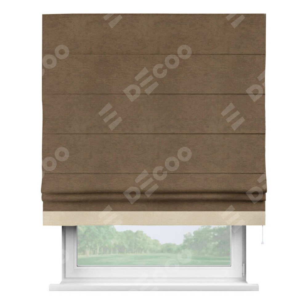 Римская штора производителя «Cortin», используется для проёма, пошита из ткани софт однотонный бронзовый, артикул 33099. Отделка шторы кантом «Джестер», ткань для канта используется из софта разной расцветки на выбор. Имеет универсальный механизм и подходит для монтажа: на потолок, на стену и в нишу.
