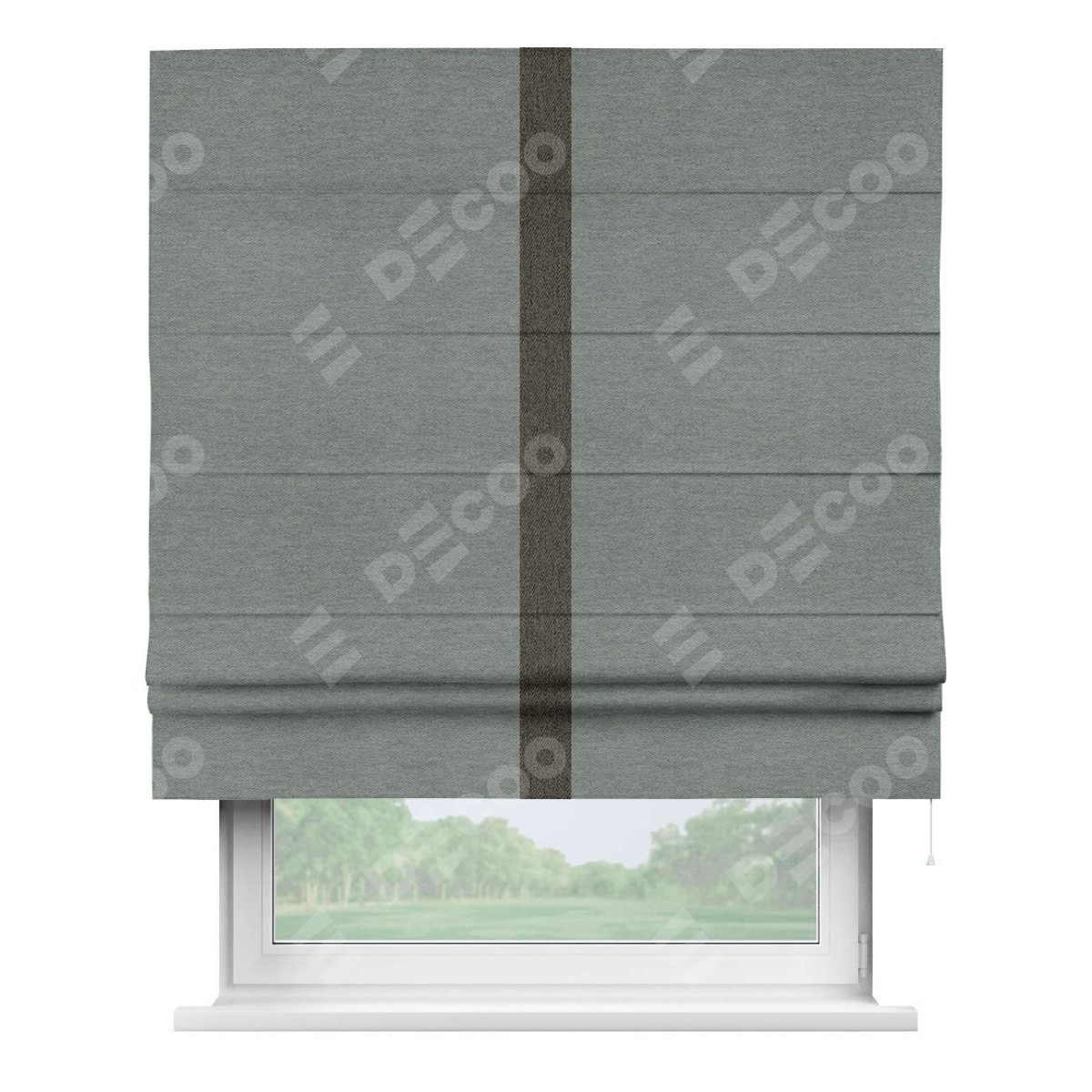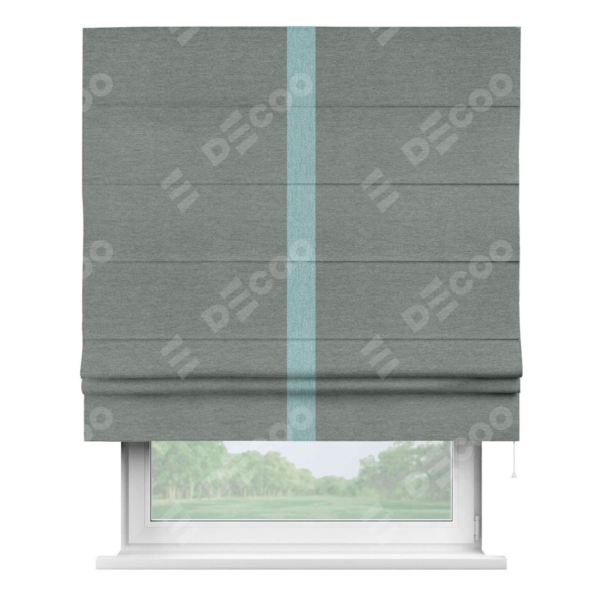 Римская штора производителя «Cortin», используется для проёма, пошита из ткани твид блэкаут серый, артикул 21577. Отделка шторы кантом «Хайвэй», ткань для канта используется из твида разной расцветки на выбор. Имеет универсальный механизм и подходит для монтажа: на потолок, на стену и в нишу.
