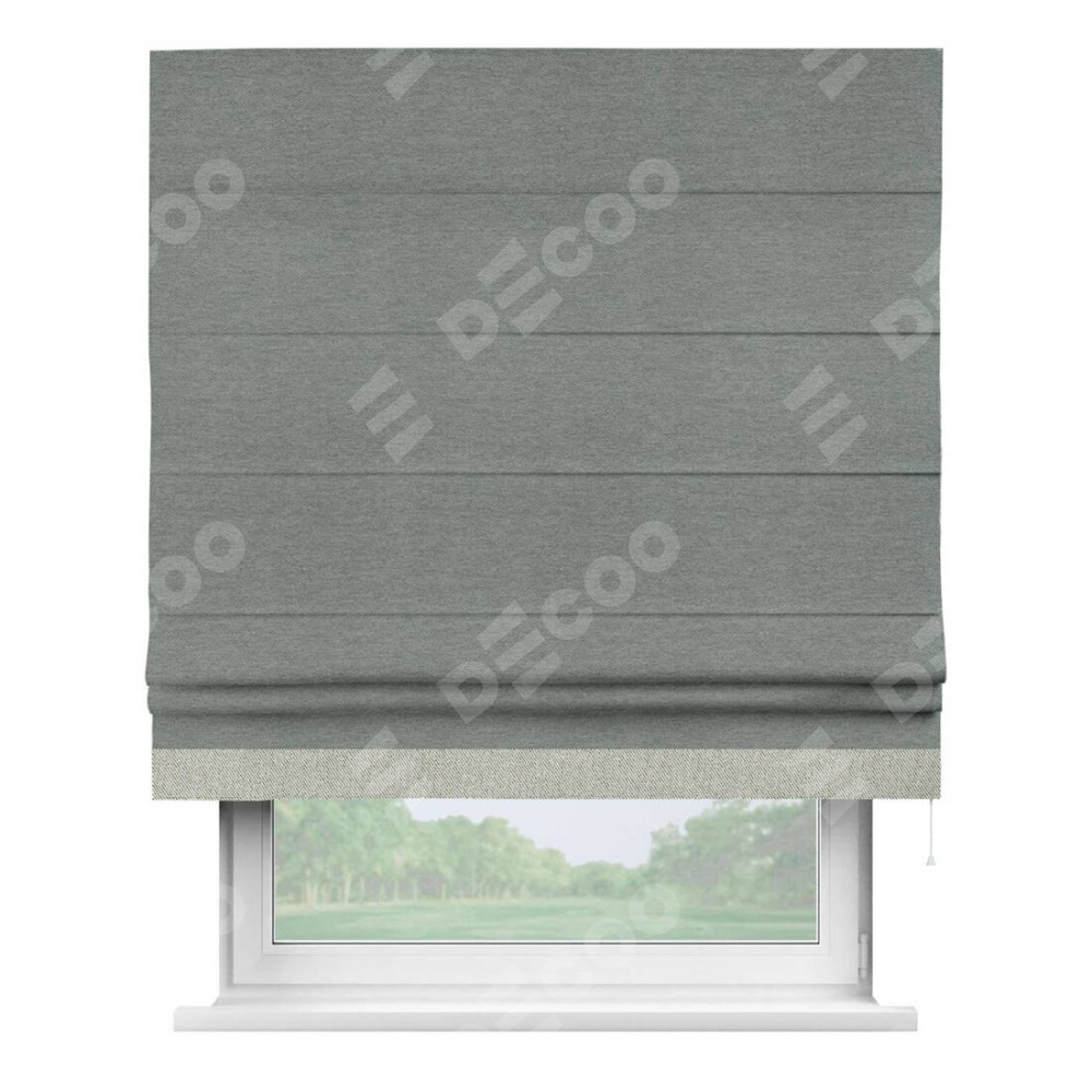 Римская штора производителя «Cortin», используется для проёма, пошита из ткани твид блэкаут серый, артикул 21577. Отделка шторы кантом «Джестер», ткань для канта используется из твида разной расцветки на выбор. Имеет универсальный механизм и подходит для монтажа: на потолок, на стену и в нишу.