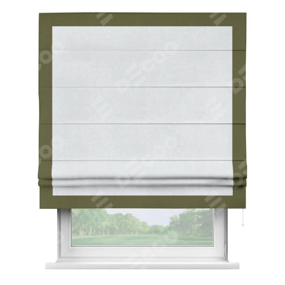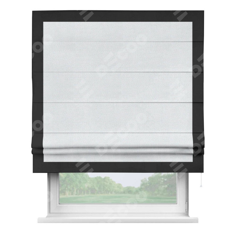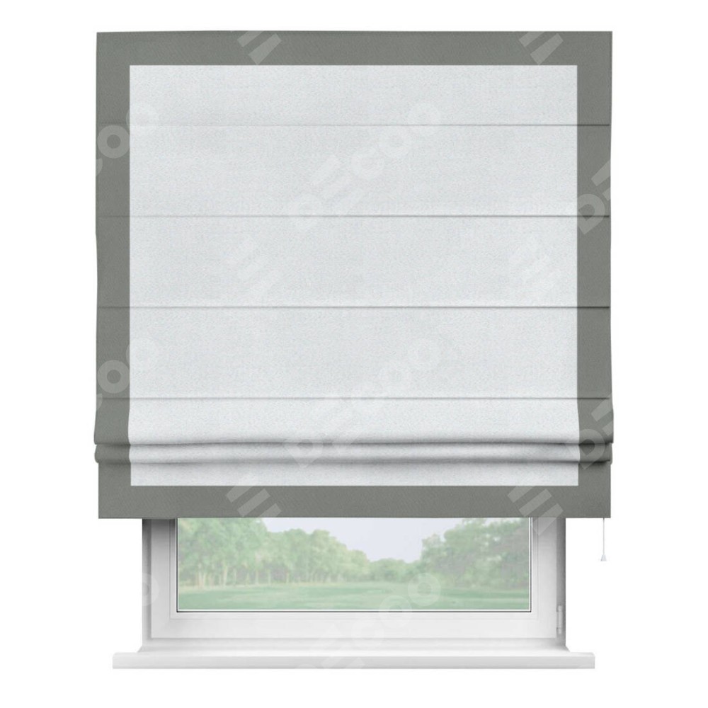 Римская штора производителя «Cortin», используется для проёма, пошита из ткани блэкаут однотонный дымчато-белый, артикул ткани 101. Отделка шторы кантом «Чесс», ткань для канта используется из блэкаута однотонного разной расцветки на выбор. Имеет универсальный механизм и подходит для монтажа: на потолок, на стену и в нишу.