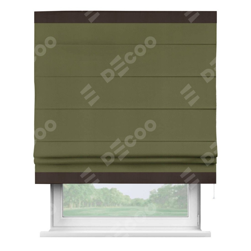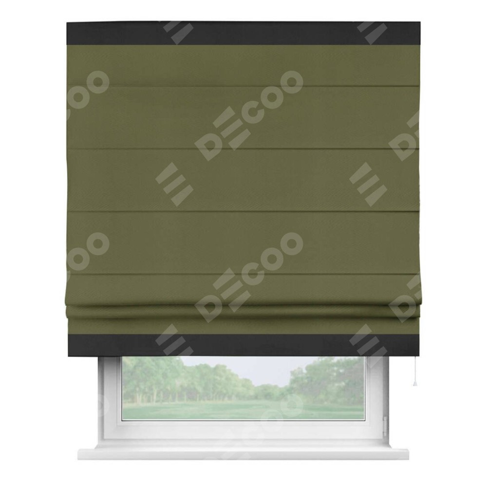 Римская штора производителя «Cortin», используется для проёма, пошита из ткани блэкаут однотонный зелёный, артикул ткани 81859. Отделка шторы кантом «Горизонт», ткань для канта используется из блэкаута однотонного разной расцветки на выбор. Имеет универсальный механизм и подходит для монтажа: на потолок, на стену и в нишу.