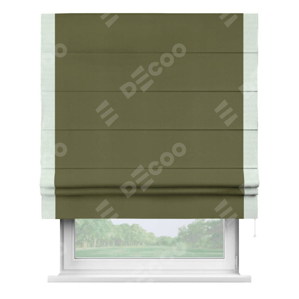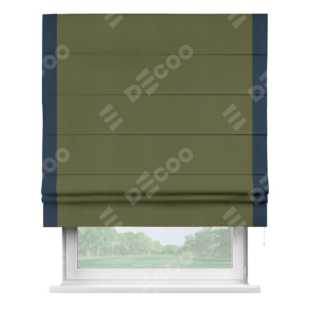 Римская штора производителя «Cortin», используется для проёма, пошита из ткани блэкаут однотонный зелёный, артикул ткани 81859. Отделка шторы кантом «Стрим Дуо», ткань для канта используется из блэкаута однотонного разной расцветки на выбор. Имеет универсальный механизм и подходит для монтажа: на потолок, на стену и в нишу.