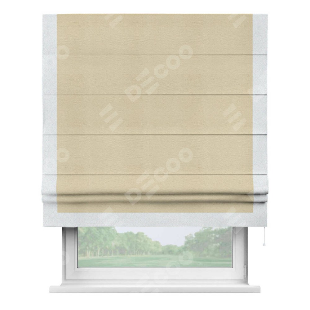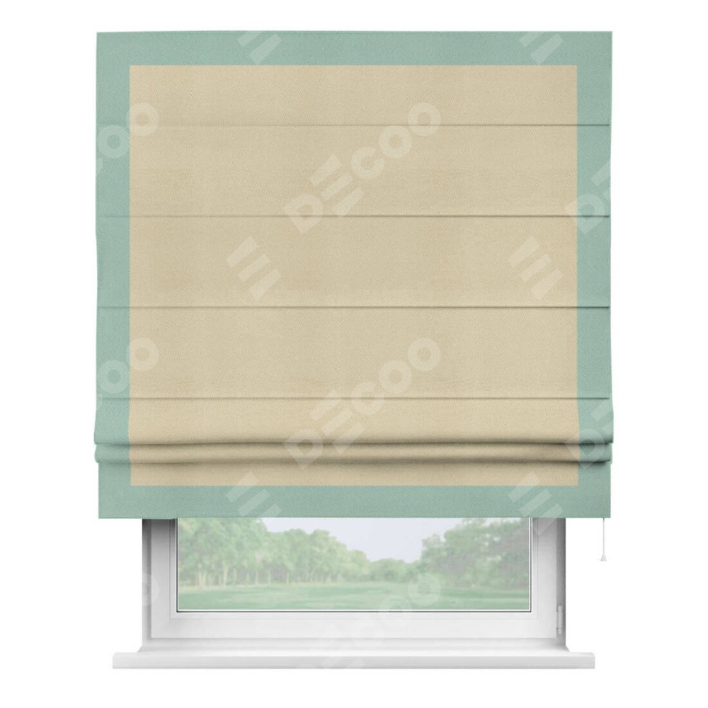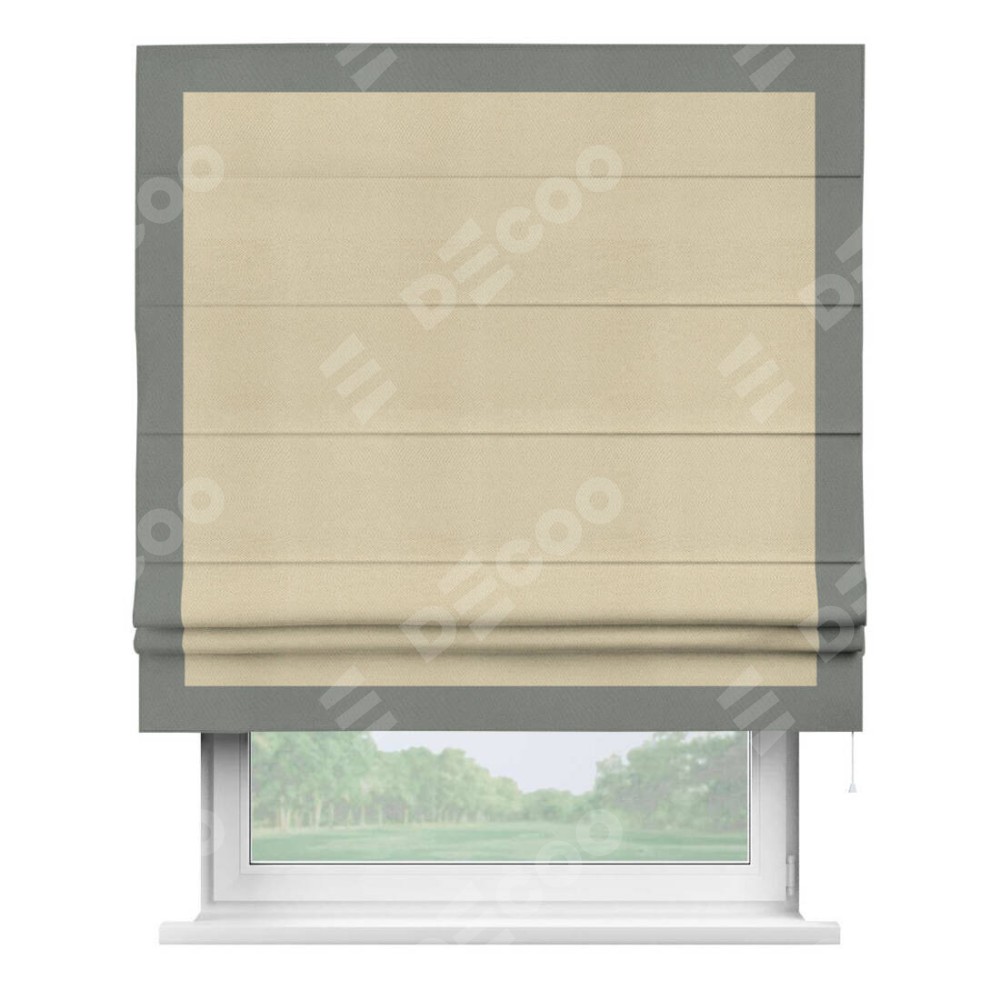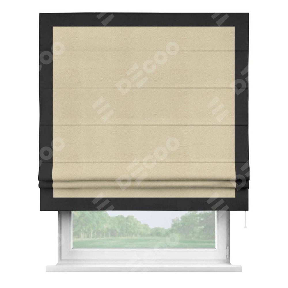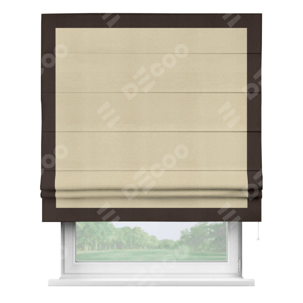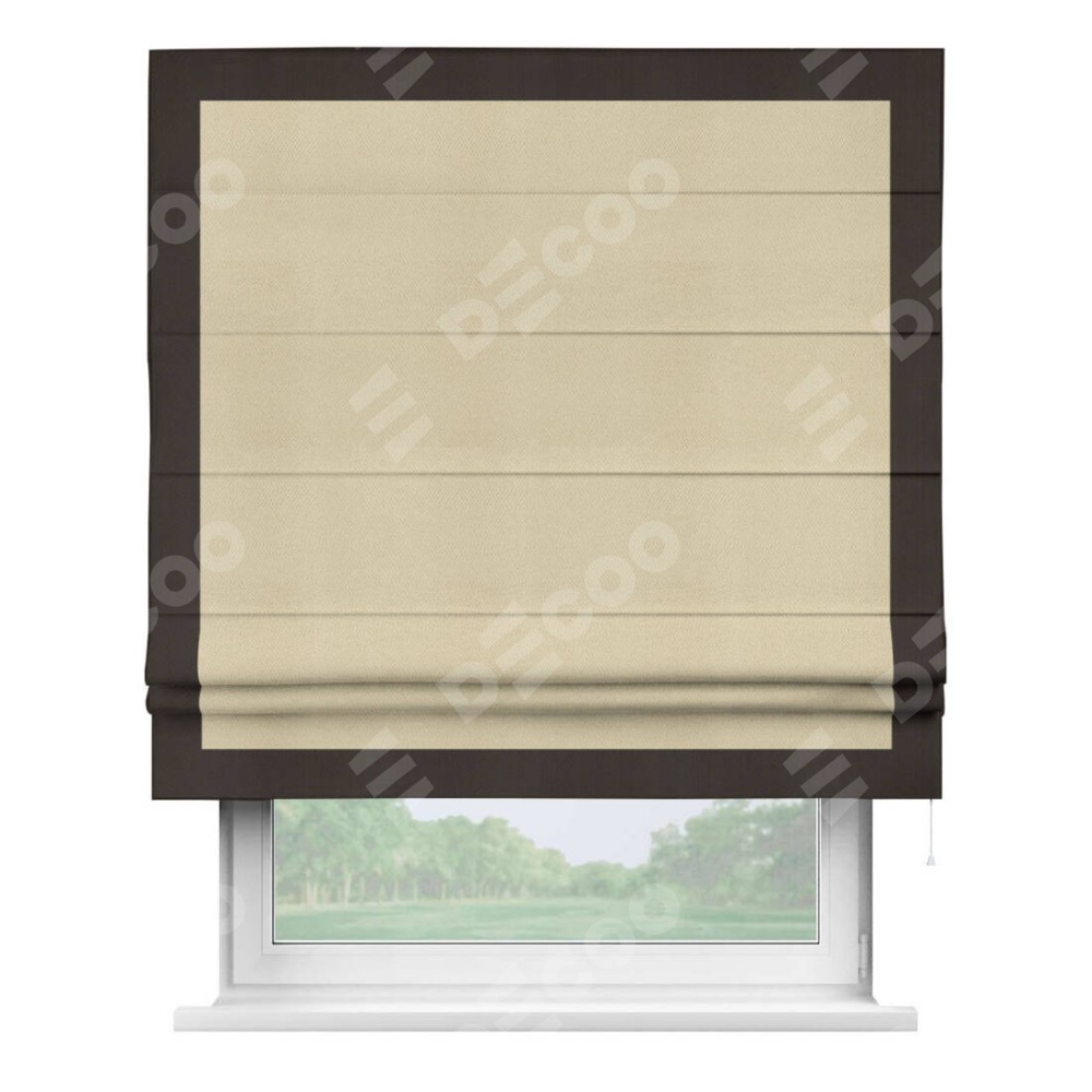Римская штора производителя «Cortin», используется для проёма, пошита из ткани блэкаут однотонный милано латте, артикул ткани 05. Отделка шторы кантом «Чесс», ткань для канта используется из блэкаута однотонного разной расцветки на выбор. Имеет универсальный механизм и подходит для монтажа: на потолок, на стену и в нишу.