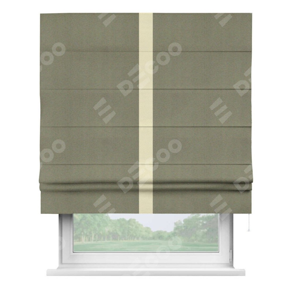 Римская штора производителя «Cortin», используется для проёма, пошита из ткани блэкаут однотонный серо-коричневый, артикул ткани 29568. Отделка шторы кантом «Хайвей», ткань для канта используется из блэкаута однотонного разной расцветки на выбор. Имеет универсальный механизм и подходит для монтажа: на потолок, на стену и в нишу.