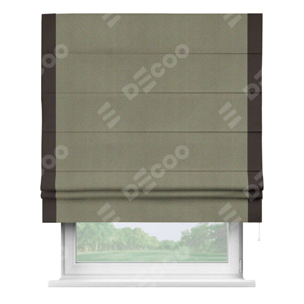 Римская штора производителя «Cortin», используется для проёма, пошита из ткани блэкаут однотонный серо-коричневый, артикул ткани 29568. Отделка шторы кантом «Стрим Дуо», ткань для канта используется из блэкаута однотонного разной расцветки на выбор. Имеет универсальный механизм и подходит для монтажа: на потолок, на стену и в нишу.
