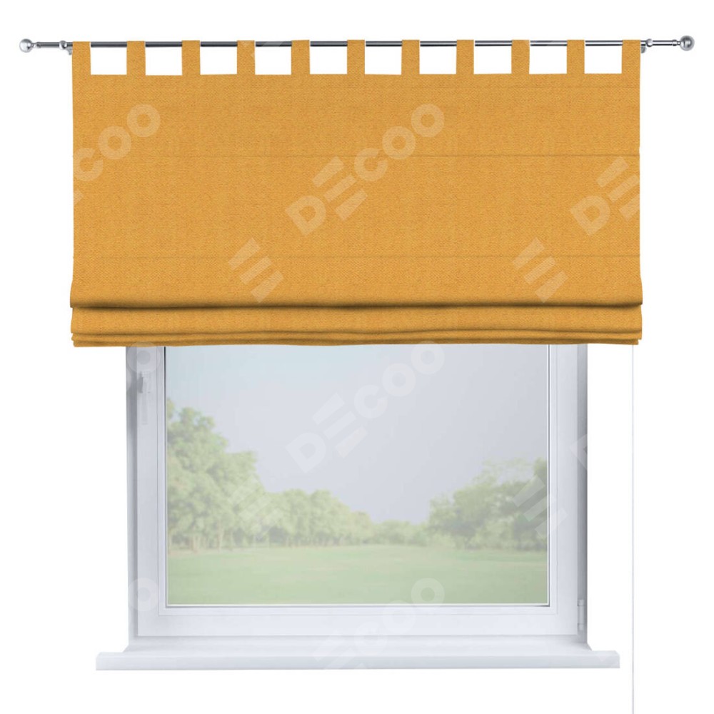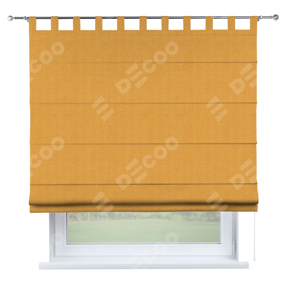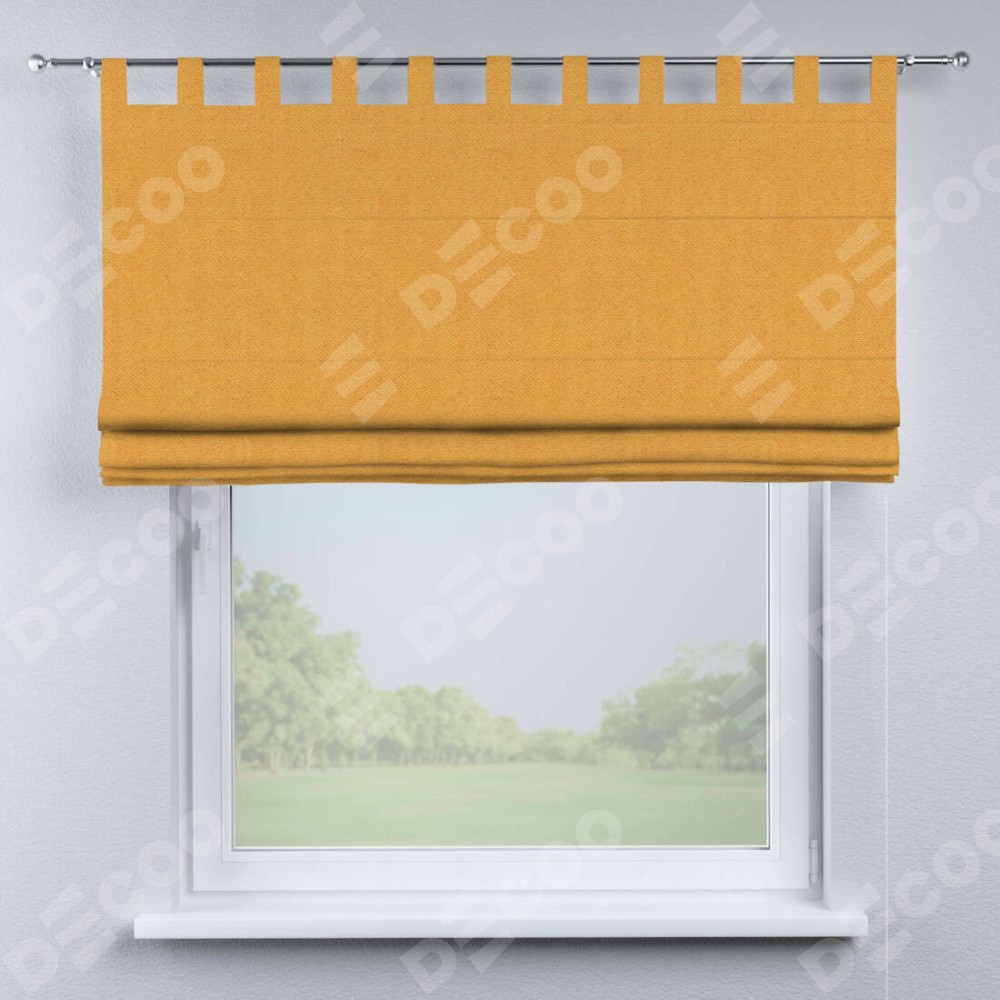 Римская штора производителя «Cortin», используется для проёма, пошита из ткани блэкаут тиснение с блеском золотой, артикул ткани 34626. Изнаночная сторона материала черного цвета, что обеспечивает необходимую светонепроницаемость. Данная модель пошита на петлях, комплектуется на выбор круглым карнизом и подходит для монтажа на стену. Римская штора на петлях имеет простую систему регулировки высоты, отличительным преимуществом данной модели является простой способ монтажа. Достаточно повесить ее на трубу и штора готова!