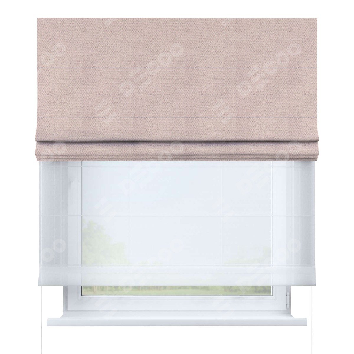 Римская штора день-ночь производителя «Cortin», используется для проёма, пошита из двух полотен, с лицевой стороны блэкаут тиснение с блеском сиреневый артикул 34649, вторая ткань тюль (по стандарту комплектуется тюль белого цвета артикул V-01). Изнаночная сторона основного материала черного цвета, что обеспечивает необходимую светонепроницаемость. Имеет универсальный механизм и подходит для монтажа: на потолок, на стену и в нишу.