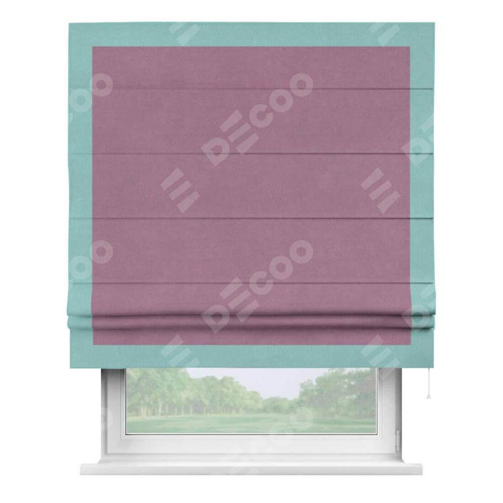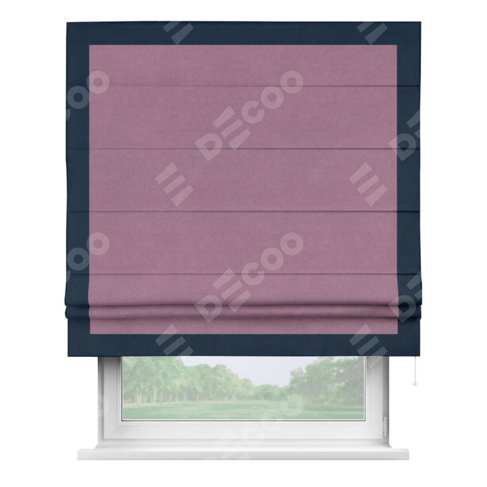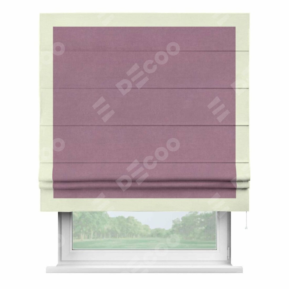 Римская штора производителя «Cortin», используется для проёма, пошита из ткани вельвет лиловый, артикул ткани 17752. Отделка шторы кантом «Чесс», ткань для канта используется из вельвета разной расцветки на выбор. Имеет универсальный механизм и подходит для монтажа: на потолок, на стену и в нишу.