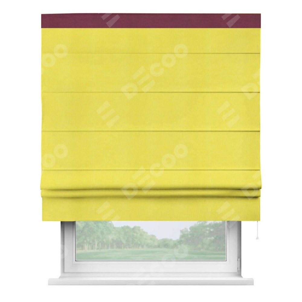 Римская штора производителя «Cortin», используется для проёма, пошита из ткани вельвет cветло-желтый, артикул ткани 30997. Отделка шторы кантом «Кинг», ткань для канта используется из вельвета разной расцветки на выбор. Имеет универсальный механизм и подходит для монтажа: на потолок, на стену и в нишу.
