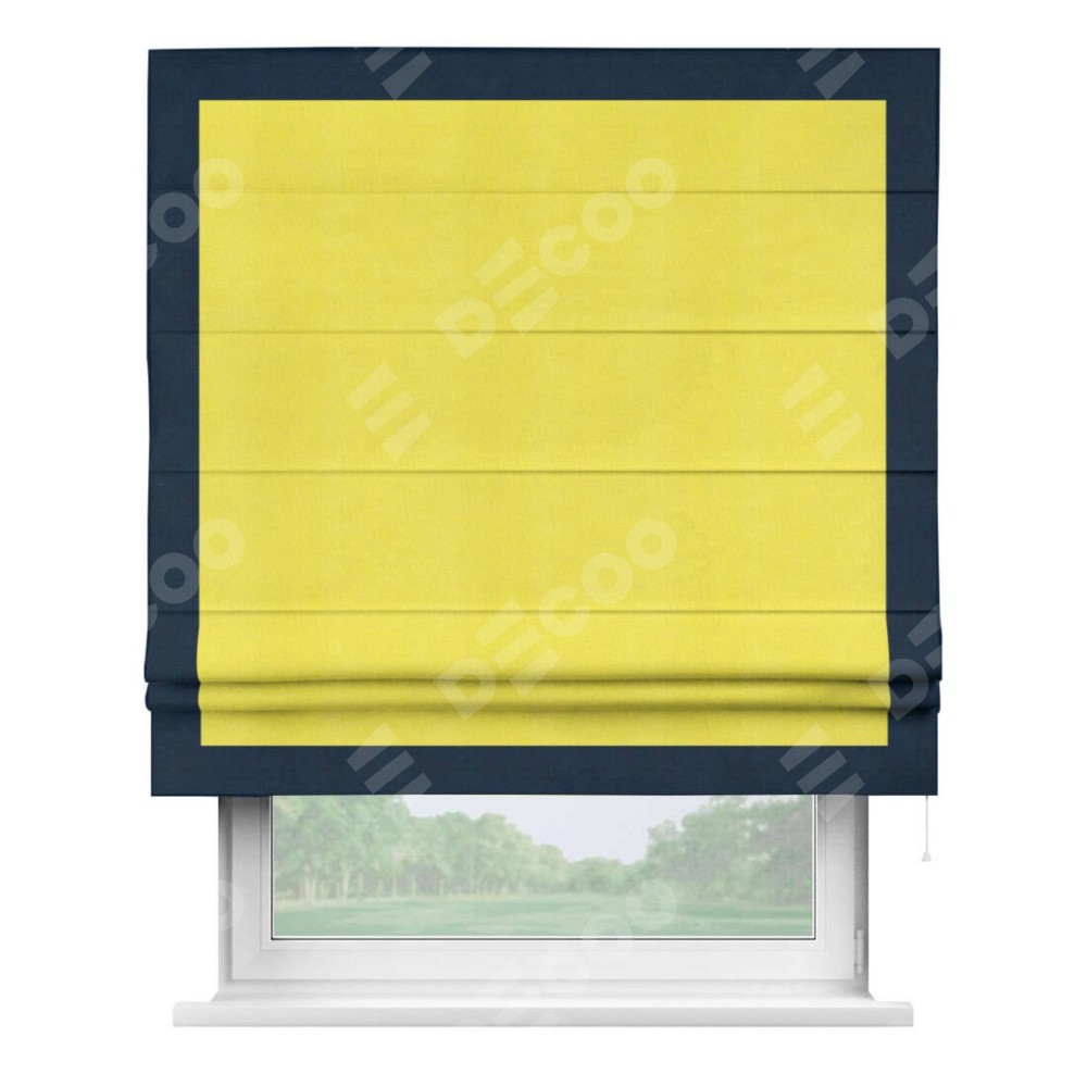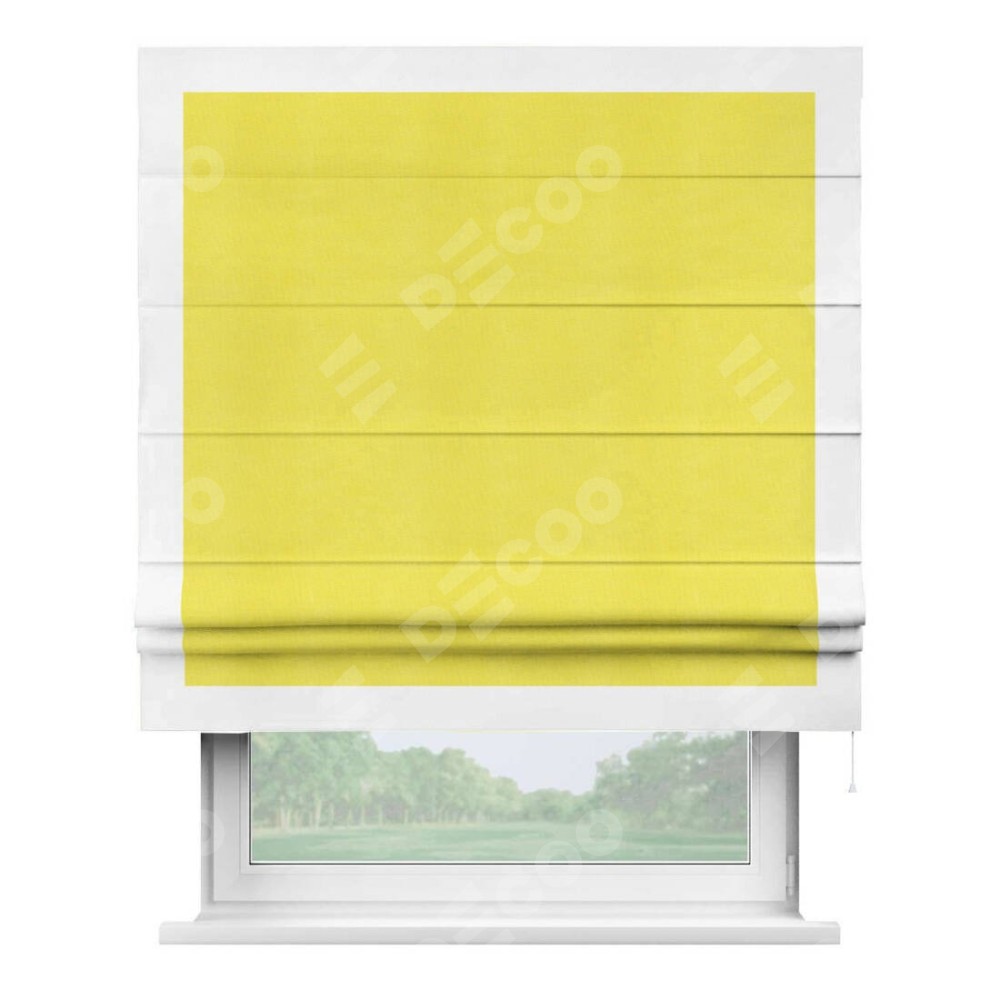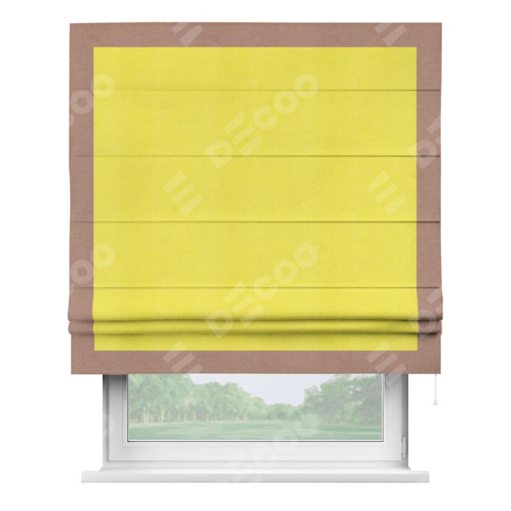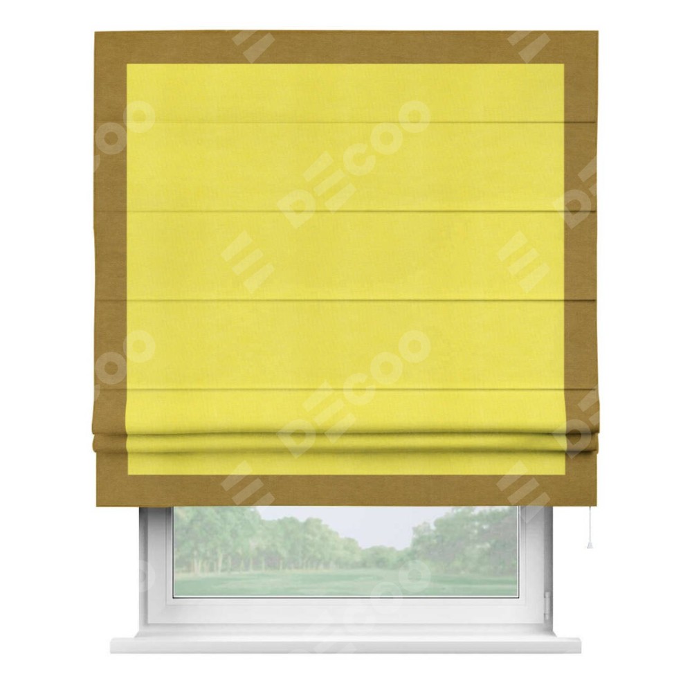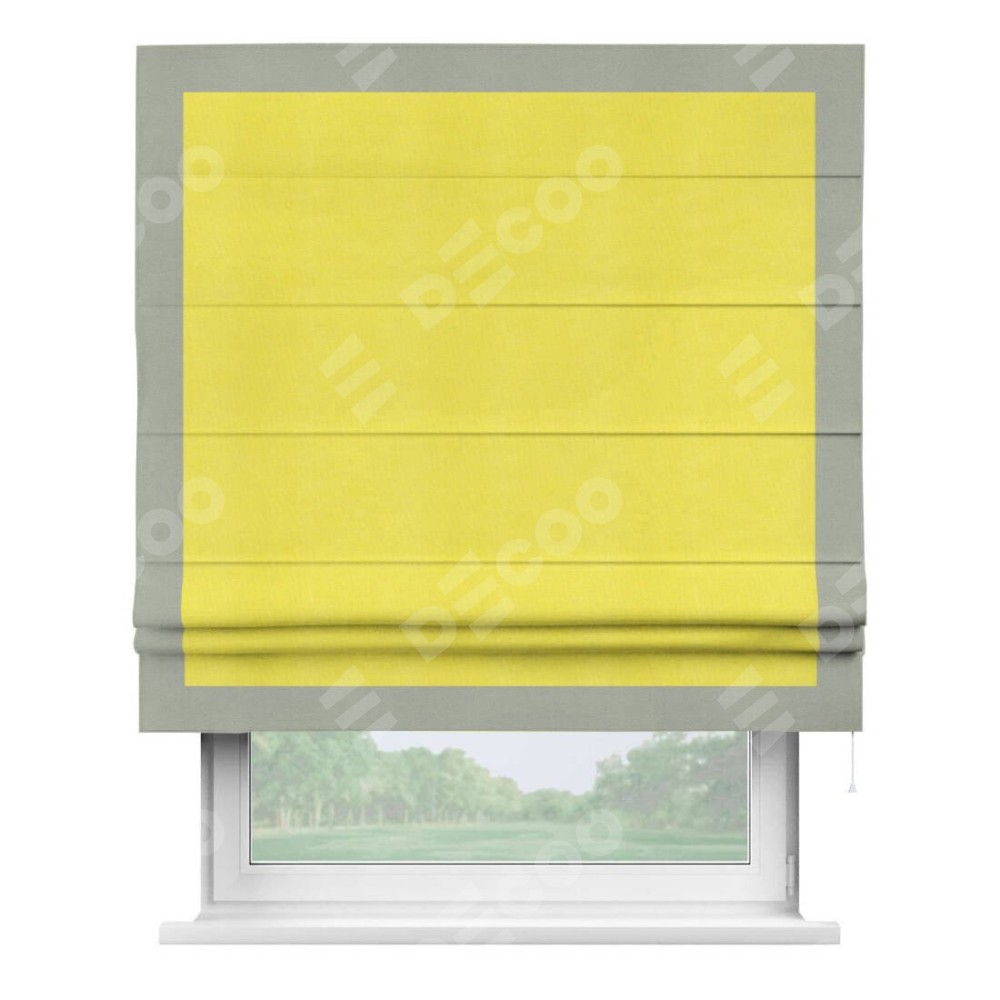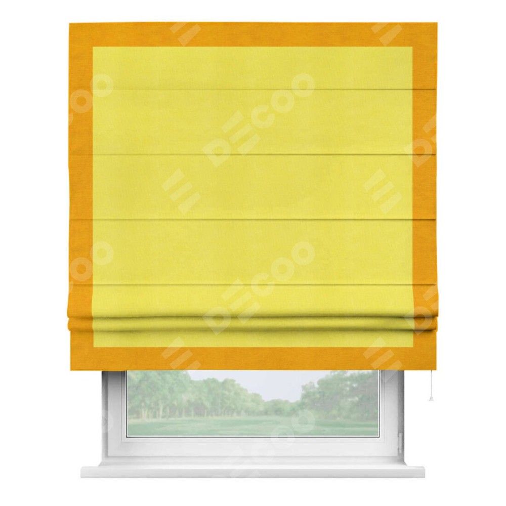 Римская штора производителя «Cortin», используется для проёма, пошита из ткани вельвет cветло-желтый, артикул ткани 30997. Отделка шторы кантом «Чесс», ткань для канта используется из вельвета разной расцветки на выбор. Имеет универсальный механизм и подходит для монтажа: на потолок, на стену и в нишу.