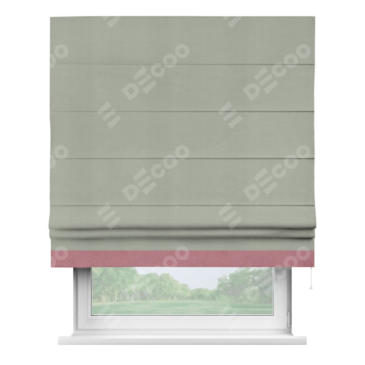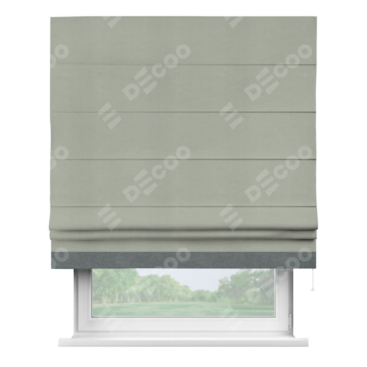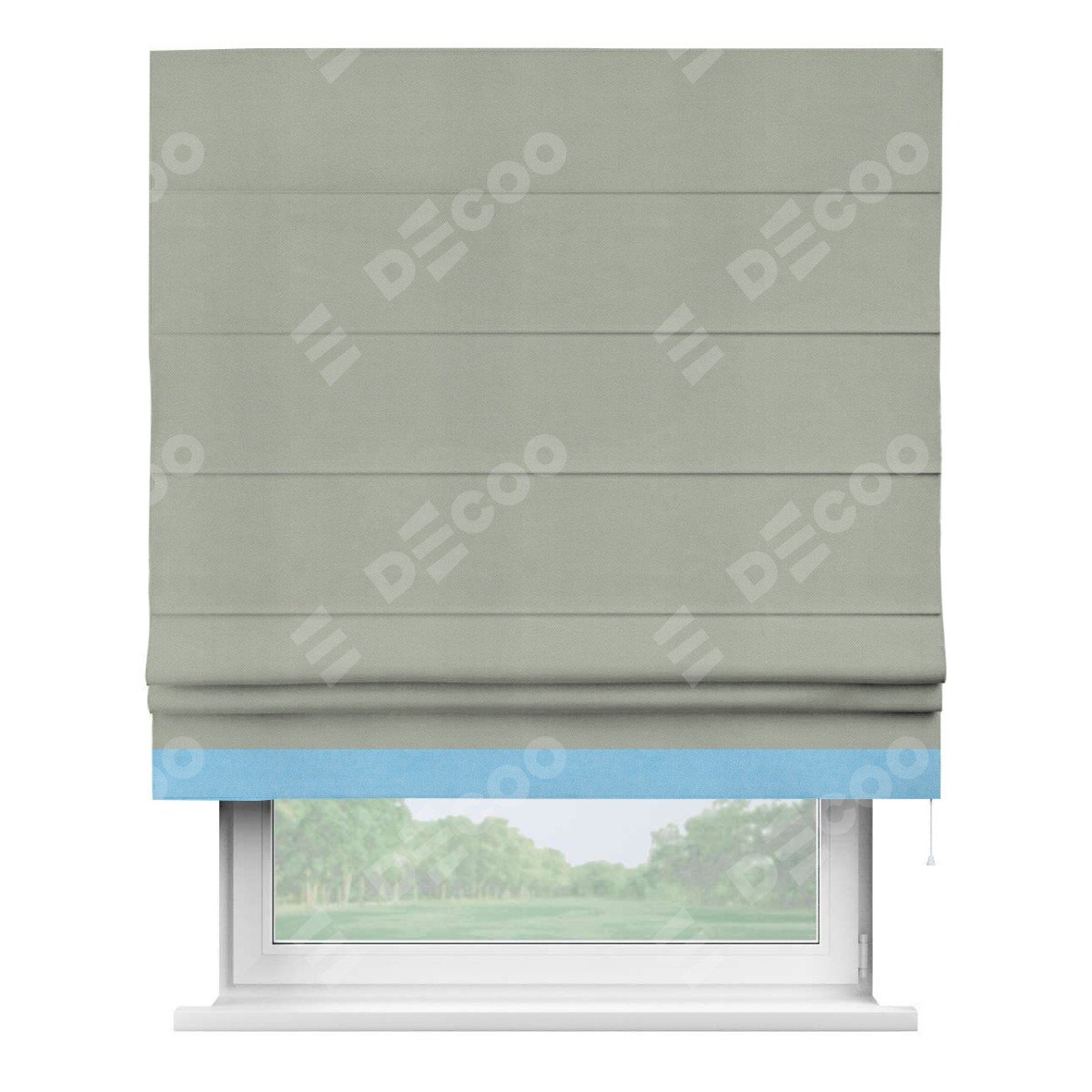 Римская штора производителя «Cortin», используется для проёма, пошита из ткани вельвет светло-серый, артикул ткани 30981. Отделка шторы кантом «Джестер», ткань для канта используется из вельвета разной расцветки на выбор. Имеет универсальный механизм и подходит для монтажа: на потолок, на стену и в нишу.