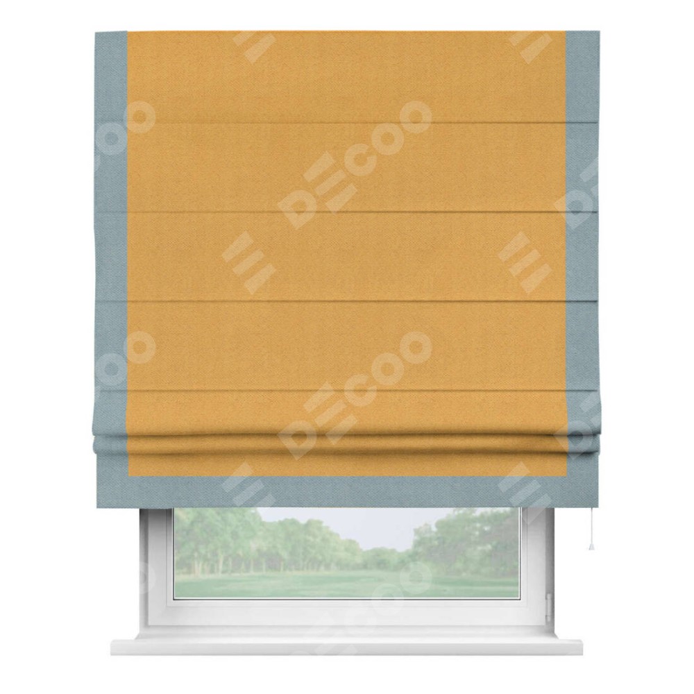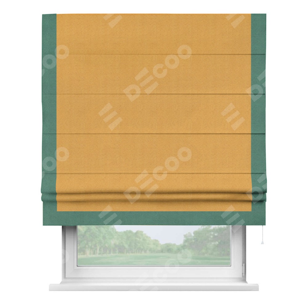 Римская штора производителя «Cortin», используется для проёма, пошита из ткани блэкаут с блеском золотой, артикул 34626. Отделка шторы кантом «Виктория», ткань для канта используется из блэкаута с блеском разной расцветки на выбор. Изнаночная сторона материала черного цвета, что обеспечивает необходимую светонепроницаемость. Имеет универсальный механизм и подходит для монтажа: на потолок, на стену и в нишу.