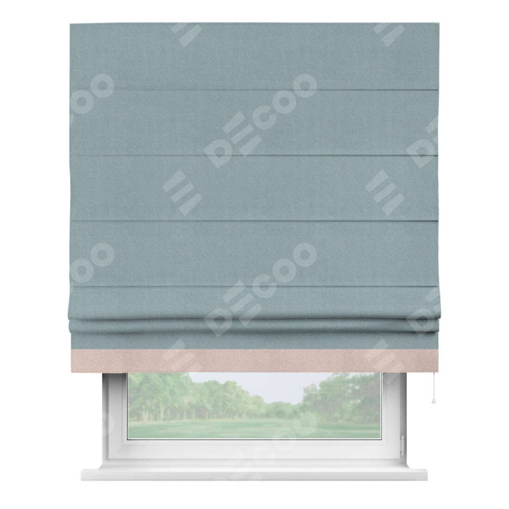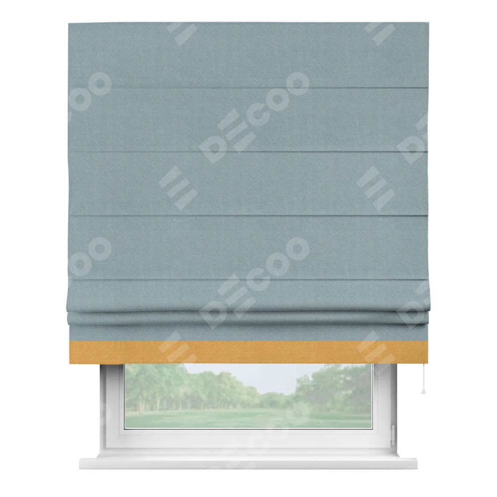Римская штора производителя «Cortin», используется для проёма, пошита из ткани блэкаут с блеском синий, артикул 34625. Отделка шторы кантом «Джестер», ткань для канта используется из блэкаута с блеском разной расцветки на выбор. Изнаночная сторона материала черного цвета, что обеспечивает необходимую светонепроницаемость. Имеет универсальный механизм и подходит для монтажа: на потолок, на стену и в нишу.