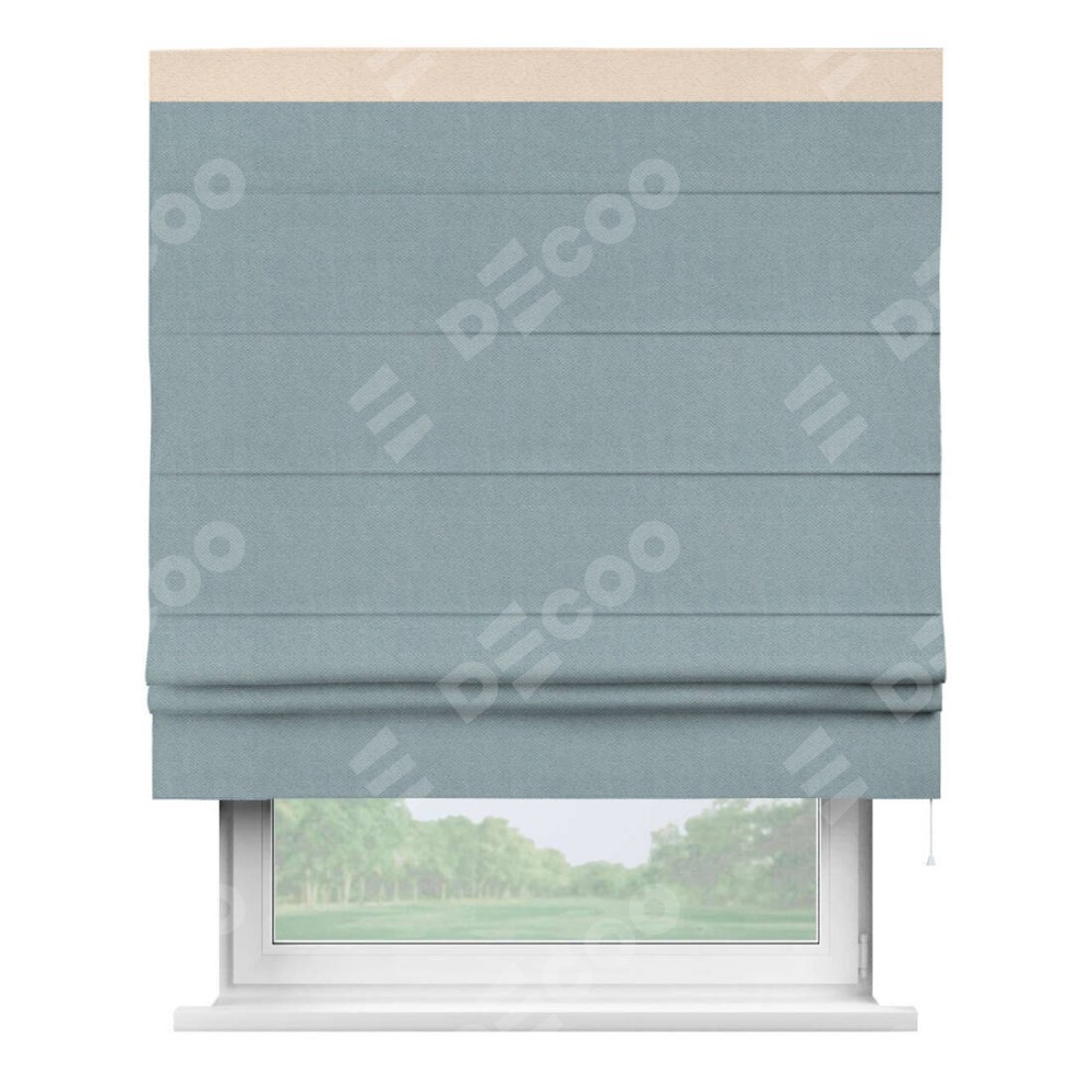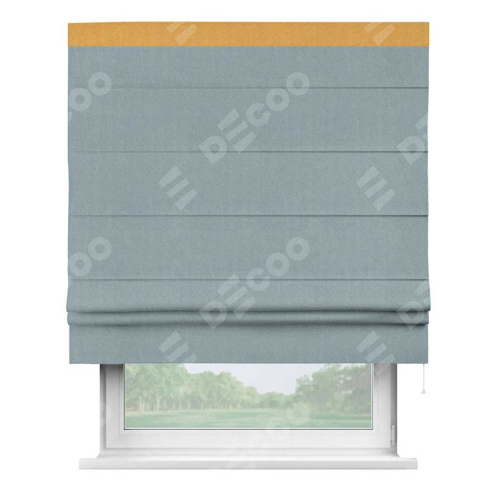 Римская штора производителя «Cortin», используется для проёма, пошита из ткани блэкаут с блеском синий, артикул 34625. Отделка шторы кантом «Кинг», ткань для канта используется из блэкаута с блеском разной расцветки на выбор. Изнаночная сторона материала черного цвета, что обеспечивает необходимую светонепроницаемость. Имеет универсальный механизм и подходит для монтажа: на потолок, на стену и в нишу.