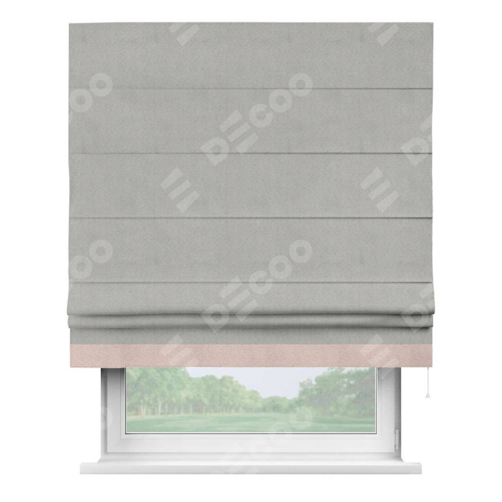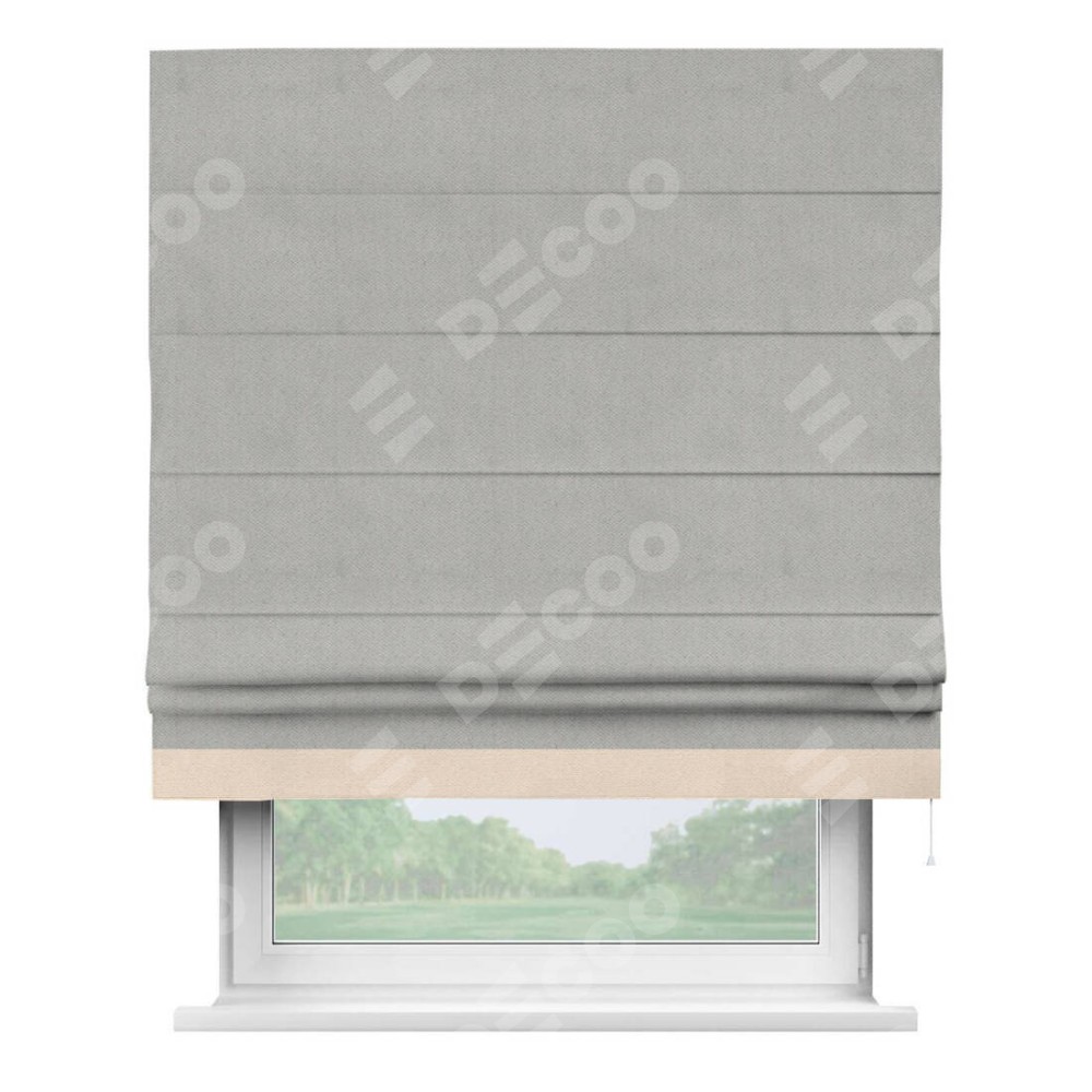 Римская штора производителя «Cortin», используется для проёма, пошита из ткани блэкаут с блеском тёмно-серый, артикул 34634. Отделка шторы кантом «Джестер», ткань для канта используется из блэкаута с блеском разной расцветки на выбор. Изнаночная сторона материала черного цвета, что обеспечивает необходимую светонепроницаемость. Имеет универсальный механизм и подходит для монтажа: на потолок, на стену и в нишу.