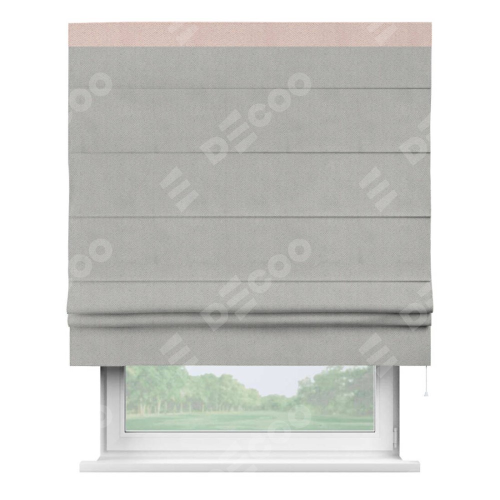 Римская штора производителя «Cortin», используется для проёма, пошита из ткани блэкаут с блеском тёмно-серый, артикул 34634. Отделка шторы кантом «Кинг», ткань для канта используется из блэкаута с блеском разной расцветки на выбор. Изнаночная сторона материала черного цвета, что обеспечивает необходимую светонепроницаемость. Имеет универсальный механизм и подходит для монтажа: на потолок, на стену и в нишу.