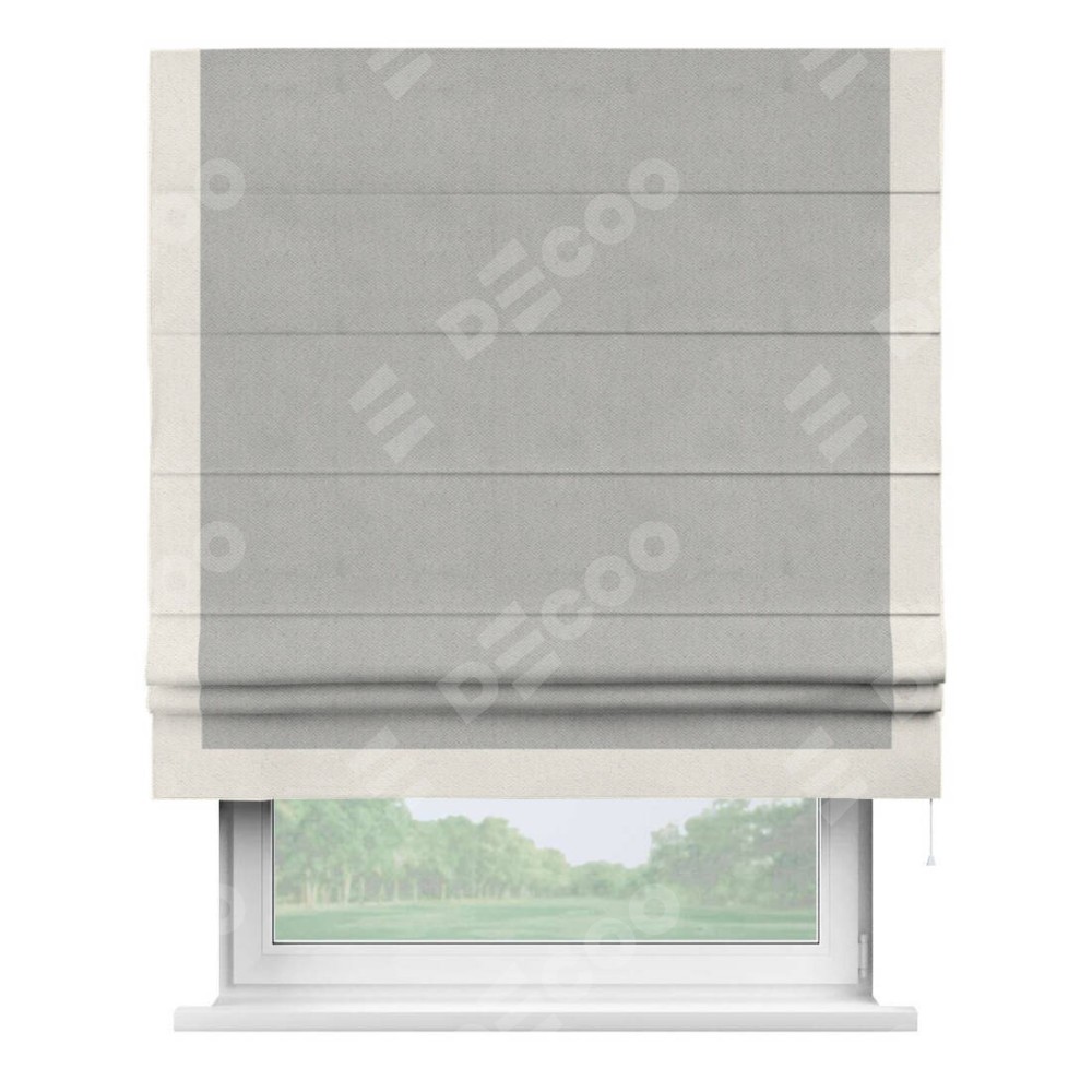 Римская штора производителя «Cortin», используется для проёма, пошита из ткани блэкаут с блеском тёмно-серый, артикул 34634. Отделка шторы кантом «Виктория», ткань для канта используется из блэкаута с блеском разной расцветки на выбор. Изнаночная сторона материала черного цвета, что обеспечивает необходимую светонепроницаемость. Имеет универсальный механизм и подходит для монтажа: на потолок, на стену и в нишу.