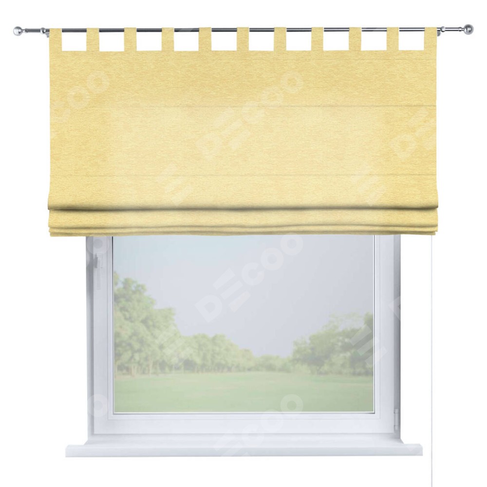 Римская штора производителя «Cortin», используется для проёма, пошита из ткани софт однотонный золотой, артикул ткани 42934. Данная модель пошита на петлях, комплектуется на выбор круглым карнизом и подходит для монтажа на стену. Римская штора на петлях имеет простую систему регулировки высоты, отличительным преимуществом данной модели является простой способ монтажа. Достаточно повесить ее на трубу и штора готова!