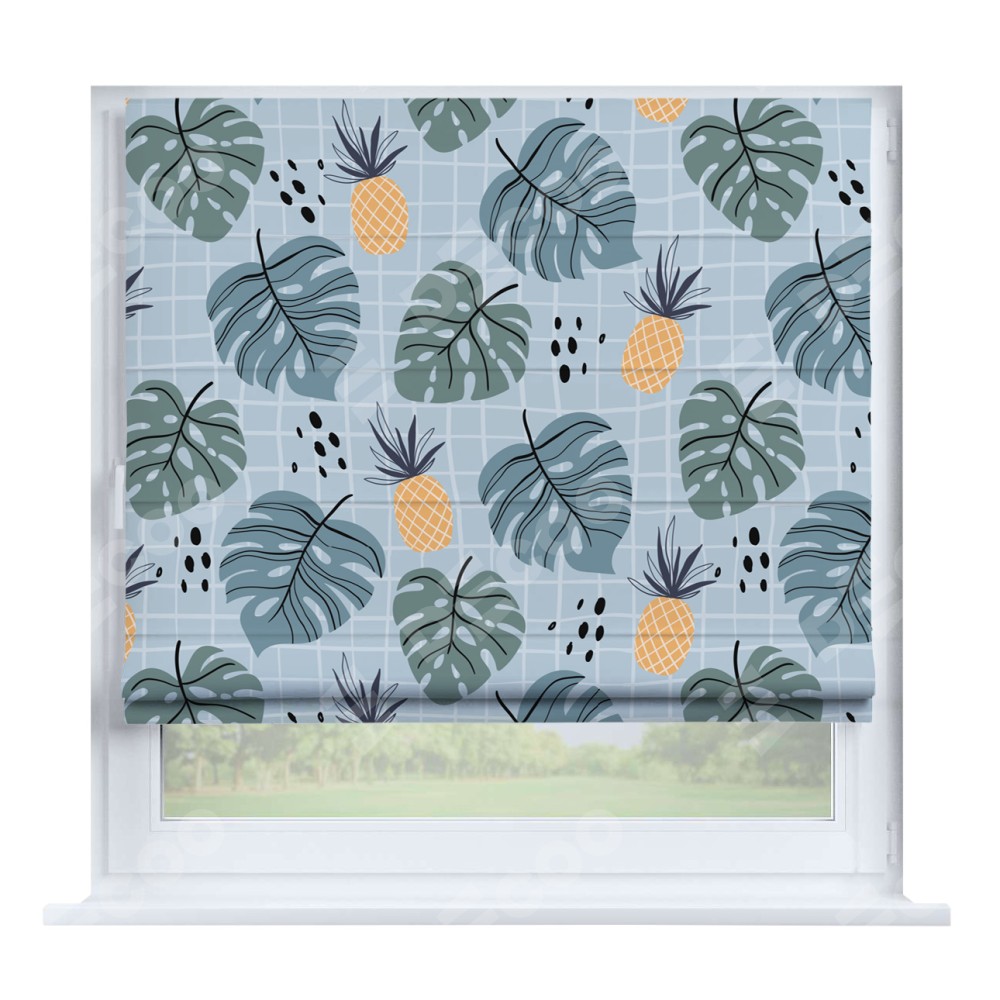 Римская штора производителя «Cortin», устанавливается на створку окна, пошита из ткани блэкаут с нанесением сублимационной печати «Ананасы и листья монстеры». Штора шьётся по индивидуальным размерам, для данного типа римской шторы возможная ширина от 35 до 150 см., высота до 250 см.
