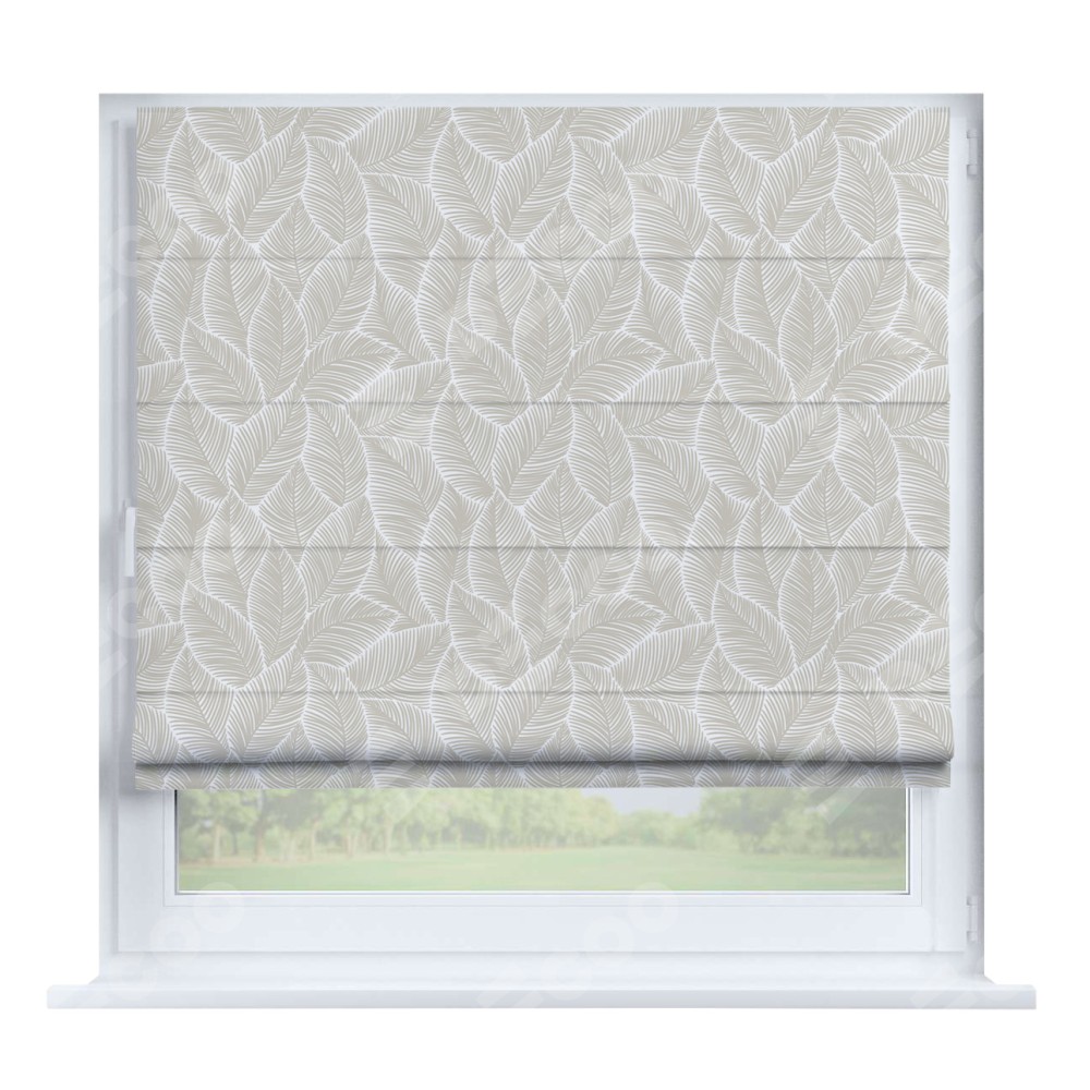 Римская штора производителя «Cortin», устанавливается на створку окна, пошита из ткани блэкаут с нанесением сублимационной печати «Бежевые листья». Штора шьётся по индивидуальным размерам, для данного типа римской шторы возможная ширина от 35 до 150 см., высота до 250 см.