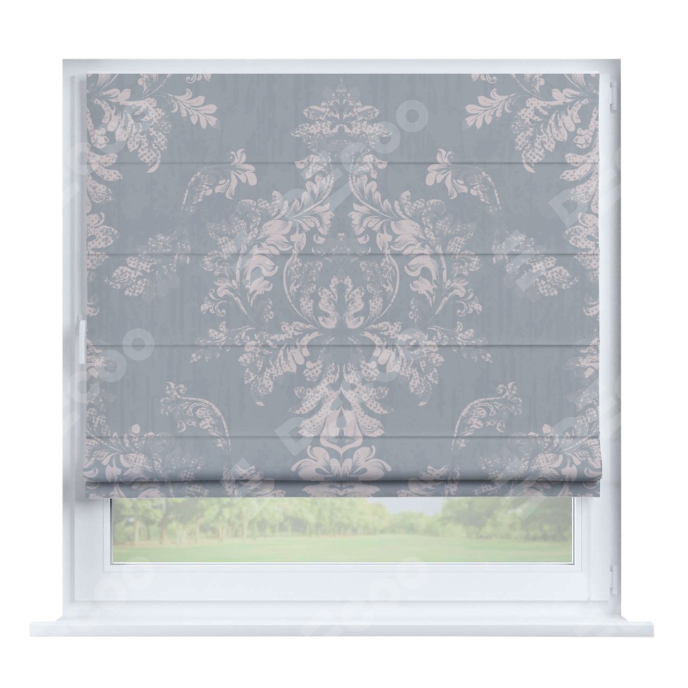 Римская штора производителя «Cortin», устанавливается на створку окна, пошита из ткани блэкаут с нанесением сублимационной печати «Винтажный узор серый». Штора шьётся по индивидуальным размерам, для данного типа римской шторы возможная ширина от 35 до 150 см., высота до 250 см.