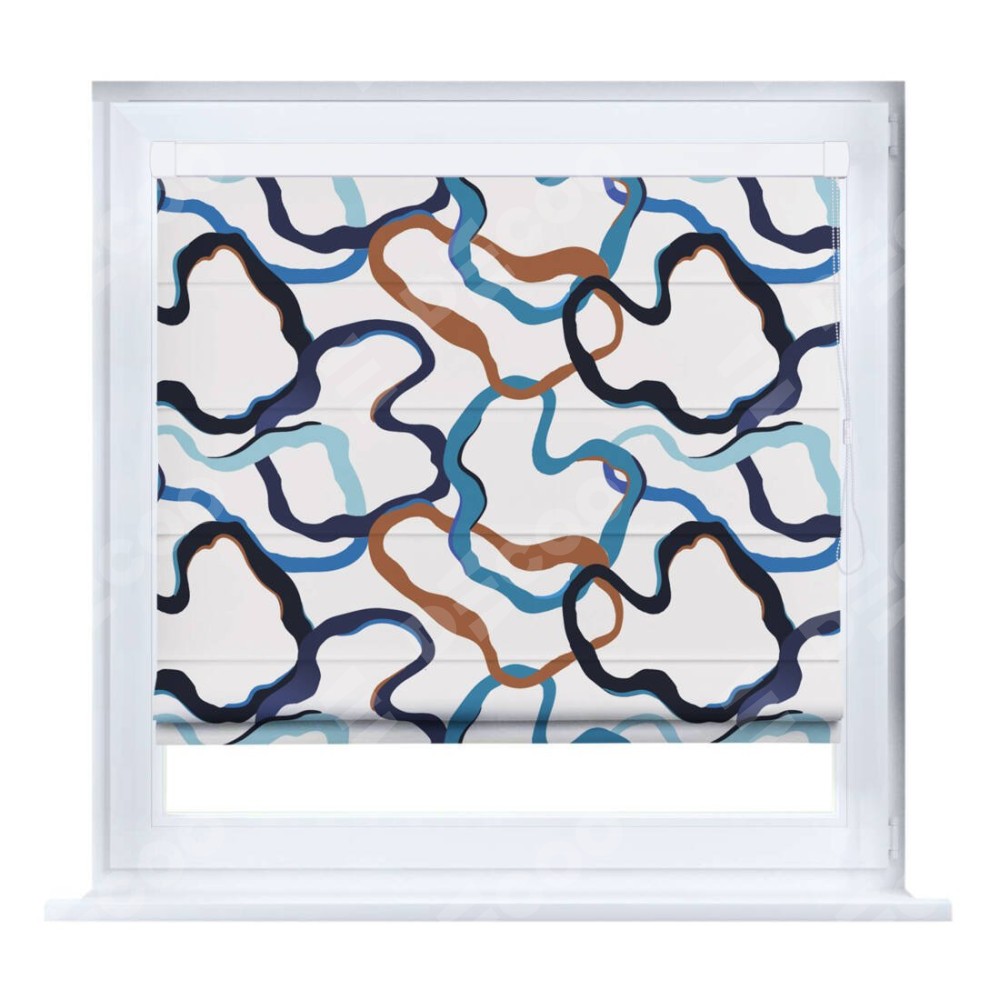 Римская штора производителя «Cortin», устанавливается на створку окна, пошита из ткани блэкаут с нанесением сублимационной печати «Волнистые ленты». Штора шьётся по индивидуальным размерам, для данного типа римской шторы возможная ширина от 35 до 150 см., высота до 250 см.
