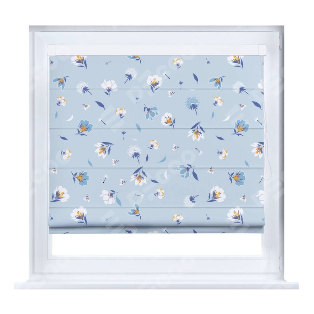 Римская штора производителя «Cortin», устанавливается на створку окна, пошита из ткани блэкаут с нанесением сублимационной печати «Голубые цветы». Штора шьётся по индивидуальным размерам, для данного типа римской шторы возможная ширина от 35 до 150 см., высота до 250 см.