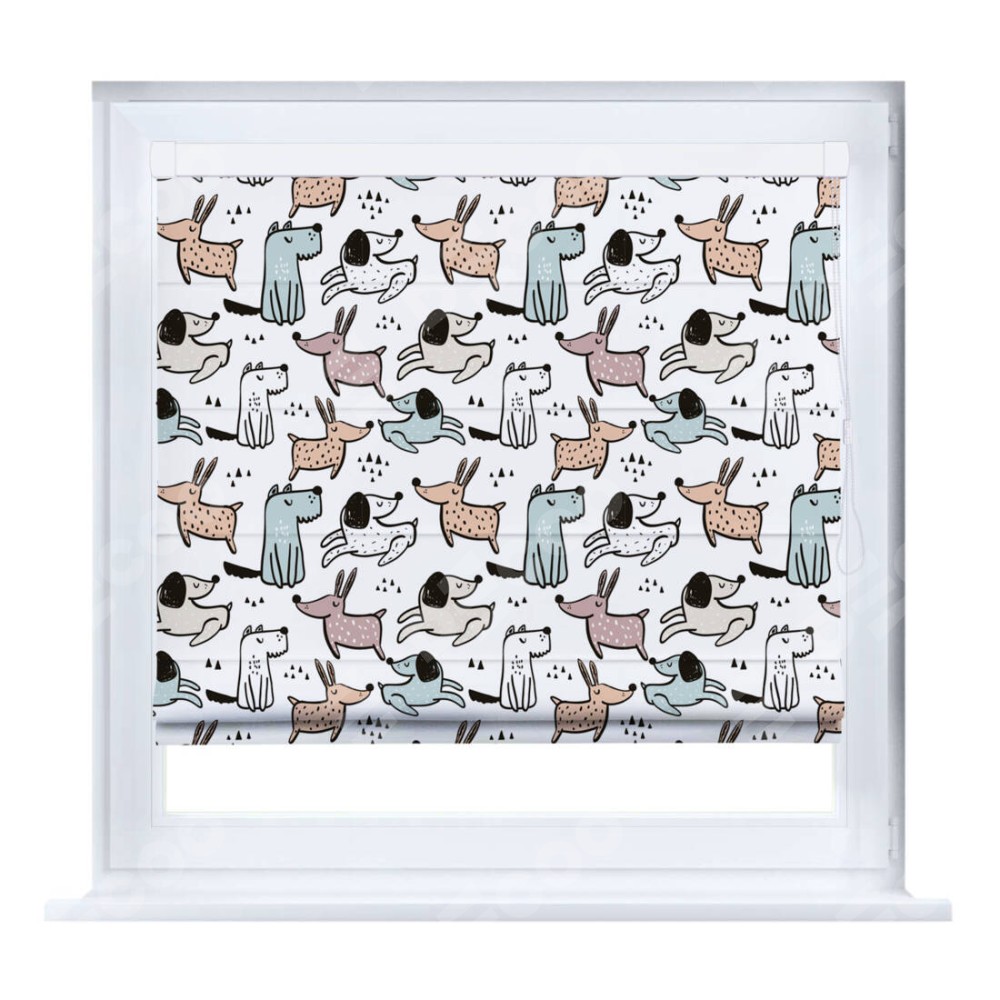 Римская штора производителя «Cortin», устанавливается на створку окна, пошита из ткани блэкаут с нанесением сублимационной печати «Очаровательные щеночки». Штора шьётся по индивидуальным размерам, для данного типа римской шторы возможная ширина от 35 до 150 см., высота до 250 см.